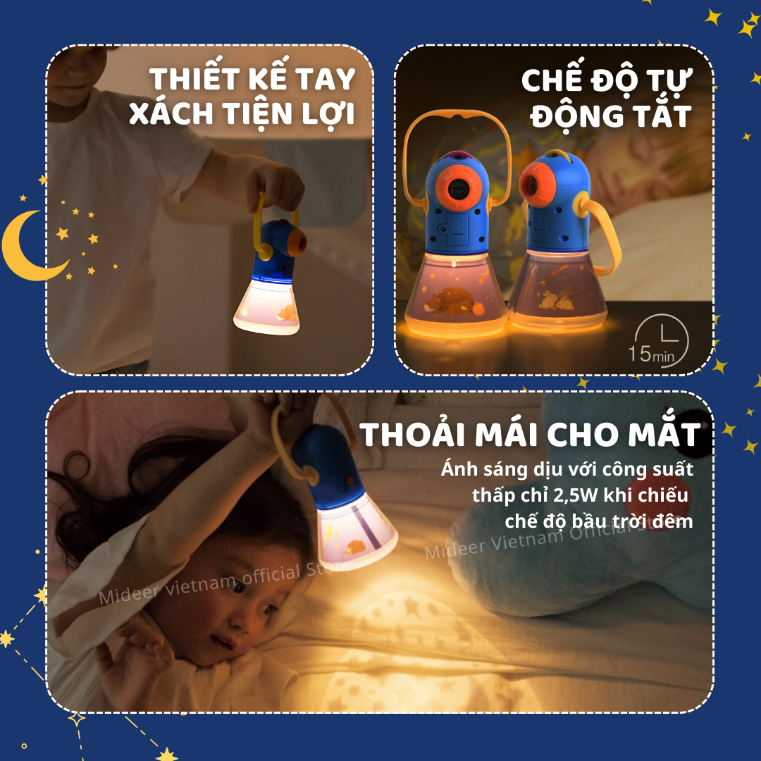 - AN TOÀN CHO TRẺ EM: Đèn làm từ nhựa ABS - là loại nhựa cứng cáp và bền bỉ. 13. CHÚNG TÔI KHÁC BIỆT: So với các đèn pin chiếu hình và máy chiếu phim trẻ em trên thị trường, đèn chiếu hình kể chuyện Mideer nổi bật với các chức năng độc quyền như Sleep Light, Starlight, Projection, Hand-held Night Light và chế độ tự động tắt – cùng nguồn sáng mạnh mẽ và gấp đôi số lượng phim. Đèn Pin Chiếu Hình Kể Chuyện Cổ Tích Mideer Kid Storybook Torch