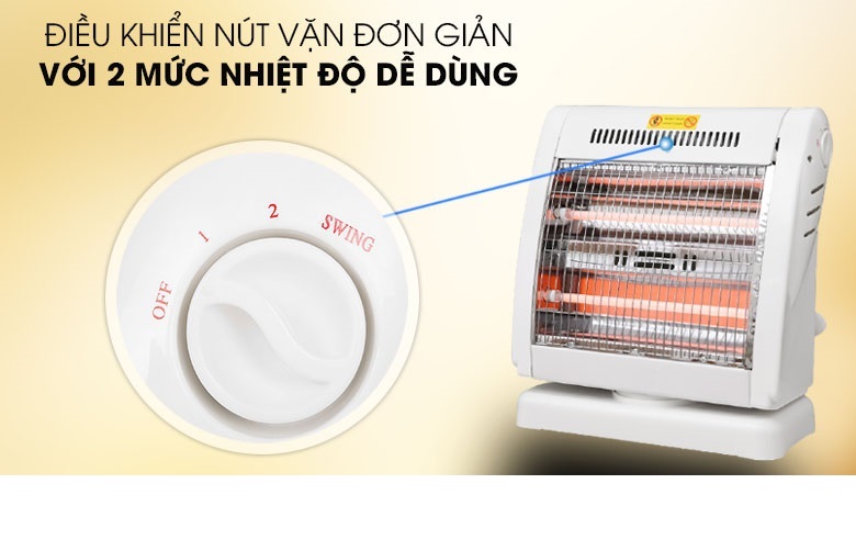 - Tự động ngắt điện khi quạt bị nghiêng hay đổ Đèn Sưởi Điện 2 Bóng Halogen 800W Xoay 90 Độ - Hàng Chính Hãng là một trong những thiết bị sưởi ấm không thể thiếu tại gia đình trong mùa đông. Sản phẩm sử dụng đèn Halogen, tỏa nhiệt đều, làm ấm nhanh, không gây khó thở và khô da, đảm bảo an toàn cho người sử dụng. Kiểu dáng sang trọng, hiện đại Đèn Sưởi Điện 2 Bóng Halogen 800W Xoay 90 Độ - Hàng Chính Hãng có thiết kế sang trọng hơn, kiểu dáng hiện đại và bắt mắt, nhỏ gọn tiết kiệm diện tích và phù hợp mọi không gian như phòng khách, phòng ngủ, Điều khiển dễ dàng bằng nút xoay Đèn Sưởi Điện 2 Bóng Halogen 800W Xoay 90 Độ - Hàng Chính Hãng có 3 mức công suất 400W, 800W điều chỉnh bằng núm vặn linh hoạt theo 2 chiều giúp bạn dễ dàng lựa chọn được mức nhiệt phù hợp với môi trường và nhu cầu sử dụng. Chắc chắn, bền đẹp, an toàn Đèn Sưởi Điện 2 Bóng Halogen 800W Xoay 90 Độ - Hàng Chính Hãng có chân đế vững chãi, lưới bảo vệ, tránh gây bỏng cho người dùng. Đặc biệt, lồng và vỏ nhựa phía sau chống cháy tuyệt đối, lưới tản nhiệt giúp sản phẩm không bị hư hỏng do quá nóng. TỎA NHIỆT ĐỀU, KHÔNG GÂY KHÔ DA Làm ấm cực nhanh, không gây khô da Đèn Sưởi Điện 2 Bóng Halogen 800W Xoay 90 Độ - Hàng Chính Hãng sử dụng đèn halogen, làm ấm cực nhanh, độ bền vượt trội, chống chói mắt hiệu quả và không đốt cháy oxy nên không gây khó thở hay khô da khi dùng. Quay đảo chiều, tỏa nhiệt đều khắp phòng Sản phẩm có khả năng quay đảo chiều liên tục, giúp tỏa nhiệt đều khắp phòng, rất thích hợp khi sử dụng tại không gian rộng như phòng khách hoặc phòng có nhiều người. An toàn với người sử dụng Đèn Sưởi Điện 2 Bóng Halogen 800W Xoay 90 Độ - Hàng Chính Hãng có chế độ tự động ngắt điện khi bị nghiêng đổ và hoạt động trở lại bình thường trở lại trạng thái an toàn. Thông số kỹ thuật