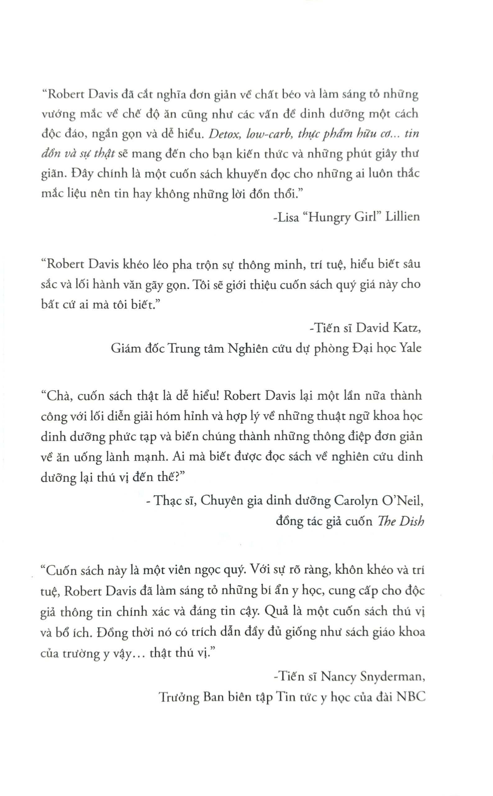 “Robert Davis đã cắt nghĩa đơn giản về chất béo và làm sáng tỏ những vướng mắc về chế độ ăn cũng như các vấn đề dinh dưỡng một cách độc đáo, ngắn gọn và dễ hiểu. Detox, low-carb, thực phẩm hữu cơ tin đồn và sự thật sẽ mang đến cho bạn kiến thức và những phút giây thư giãn. Đây chính là cuốn sách cần phải đọc với những ai luôn thắc mắc liệu nên tin hay không những lời đồn thổi.”