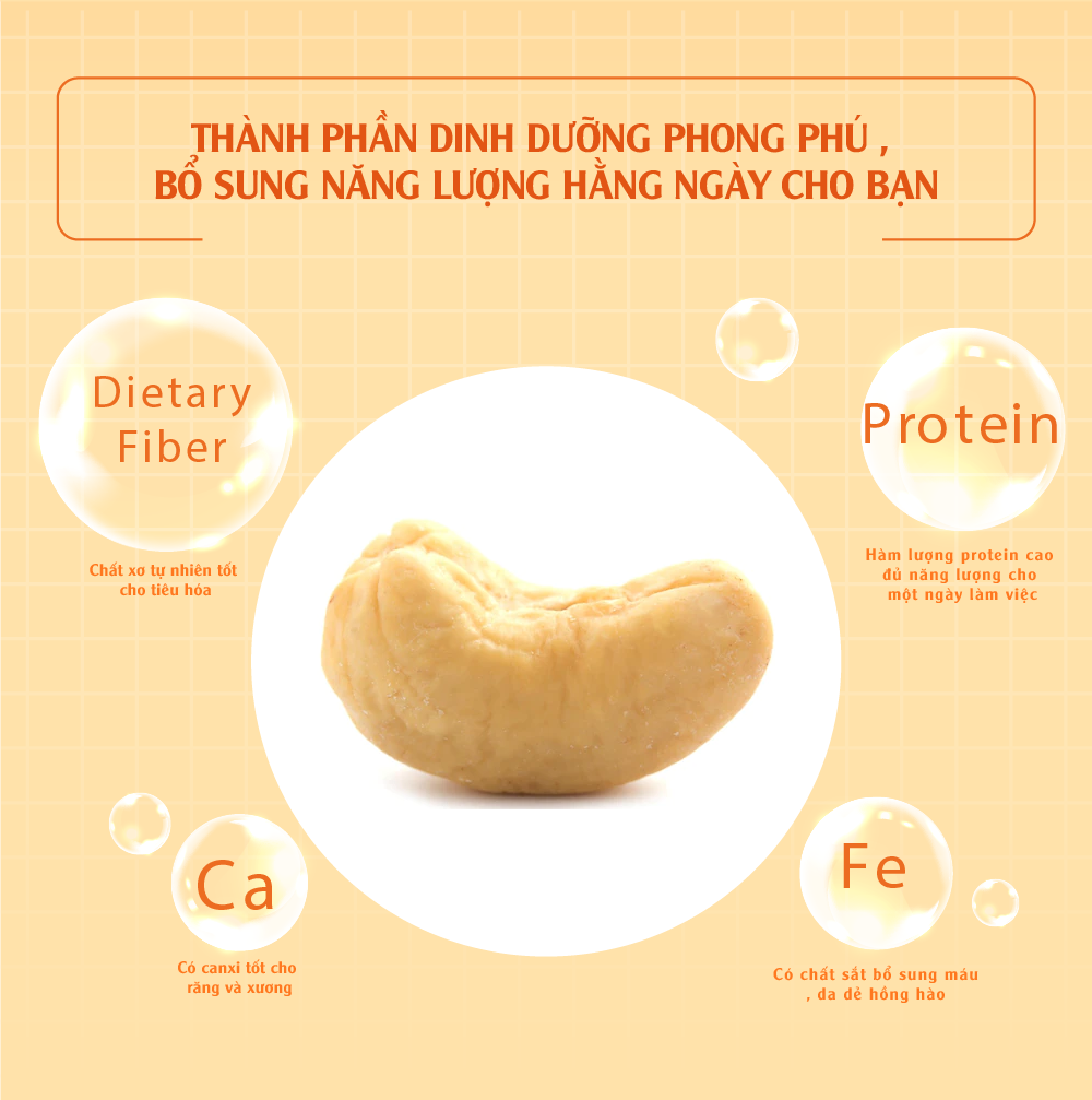 - Hạt Điều Rang Không Muối Bịch CK Fami chứa hàm lượng dinh dưỡng rất cao, 100g hạt Điều cung cấp 550 Kcalo năng lượng, hơn gấp 2 lần thịt bò. - Sản phẩm cung
