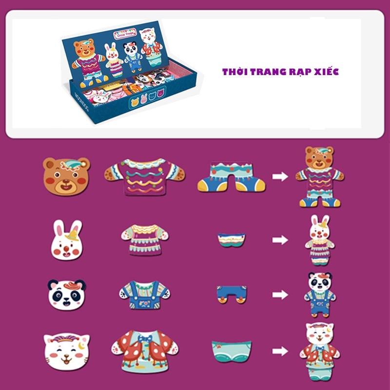 - Chất liệu: gỗ tự nhiên, các góc cạnh được bào rất nhẵn và cẩn thận an toàn cho bé khi chơi. – Bộ sản phẩm lắp ghép gồm nhiều mảnh ghép với hình gấu và màu sắc trang trí khác nhau giúp bé có thể ghép được thành những hình gấu sinh động. – Những bộ quần áo nhiều màu sắc khác nhau giúp bé nhận biết màu sắc và tăng khả năng sáng tạo cho bé.
