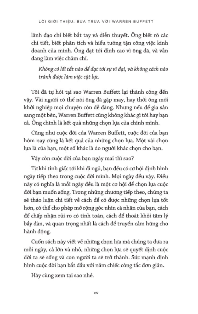 Điều gì tạo nên sự khác biệt giữa một người bình thường và những con người vĩ đại? Đó có phải là sự may mắn, xuất thân hay tài năng thiên bẩm? Trong cuốn sách này, tác giả đã chứng minh rằng bạn không cần có những điều trên để thành công. Mỗi người đều mang trong mình một sự vĩ đại, hay nói cách khác là bản thể tốt nhất của mình, và nó vẫn đang say ngủ. Để đánh thức sự vĩ đại trong mình, điều cần làm là bật lên "năm chiếc công tắc nội tại". Và việc của bạn là lựa chọn, lựa chọn bật lên năm chiếc công tắc ấy và lựa chọn sống Cuộc đời Xám nhạt hay Cuộc đời Rực rỡ.