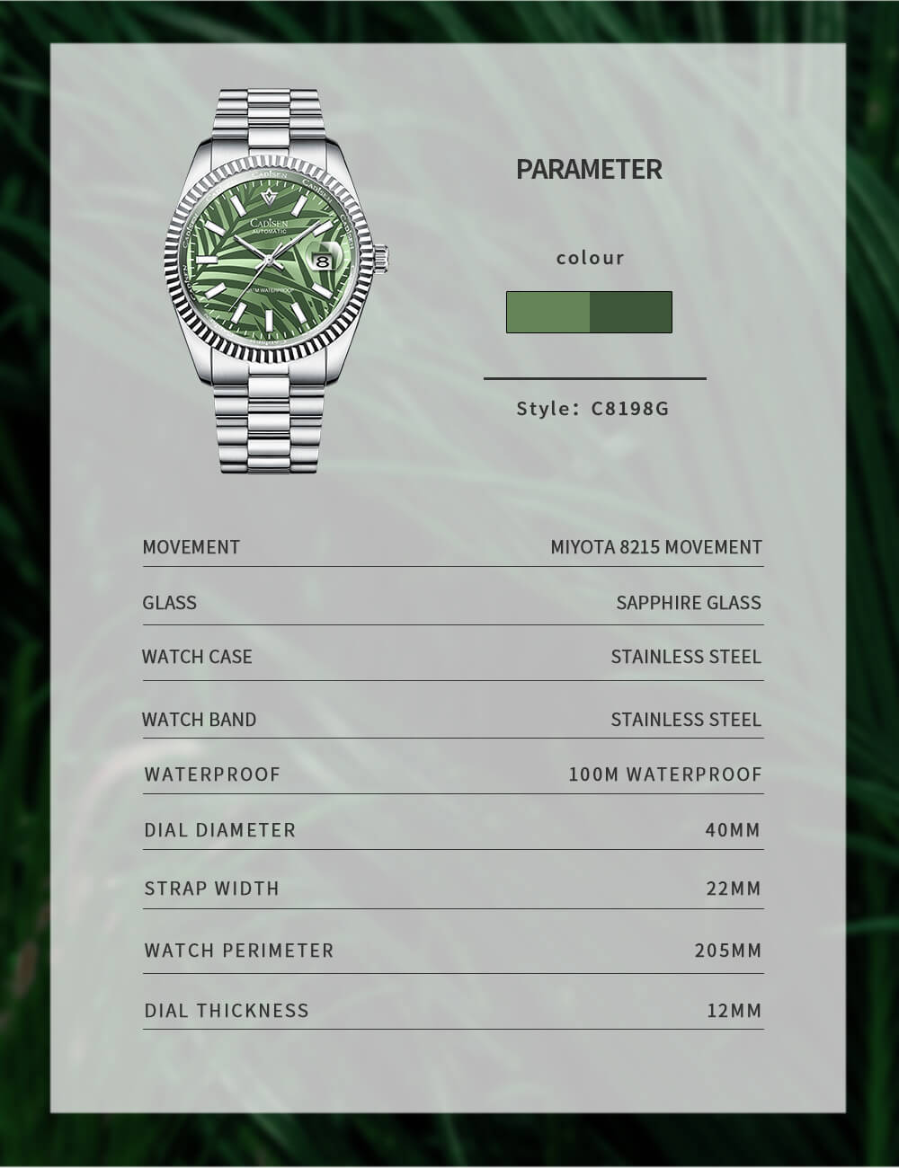 Thương Hiệu CADISEN Quốc gia đăng ký thương hiệu Nhật Bản Kiểu máy Nhật Bản (Japan Movt) Mã sản phẩm C8215M2 Giới tính Nam Loại sản phẩm Đồng hồ cơ (Automatic) Đường kính mặt 40mm