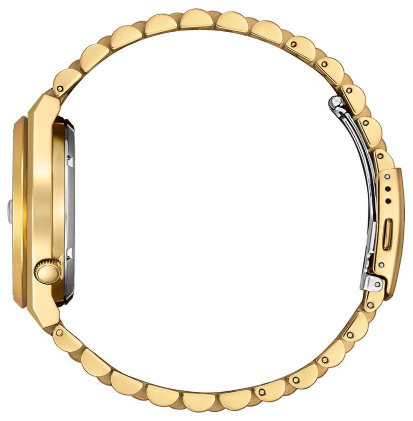 Đặc điểm kỹ thuật - - Vật liệu vỏ / gờ: Mạ ion - Chốt gập 3 chỉ với một lần bấm - Dây đeo bằng thép không gỉ - Mặt kính khoáng - Khả