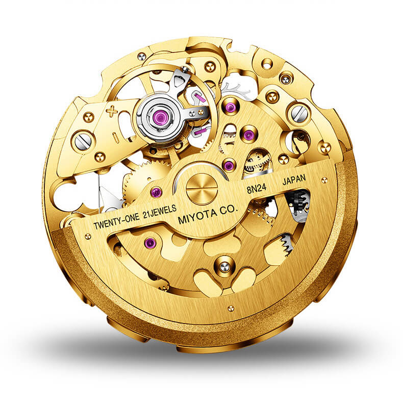 Đặc điểm kỹ thuật Dây đeo bằng da Mặt kính khoáng Chống nước Giờ hiện hành thông thường Đồng hồ kim: 3 kim (giờ, phút, giây), 3 mặt số (24 giờ, ngày, thứ) Độ chính