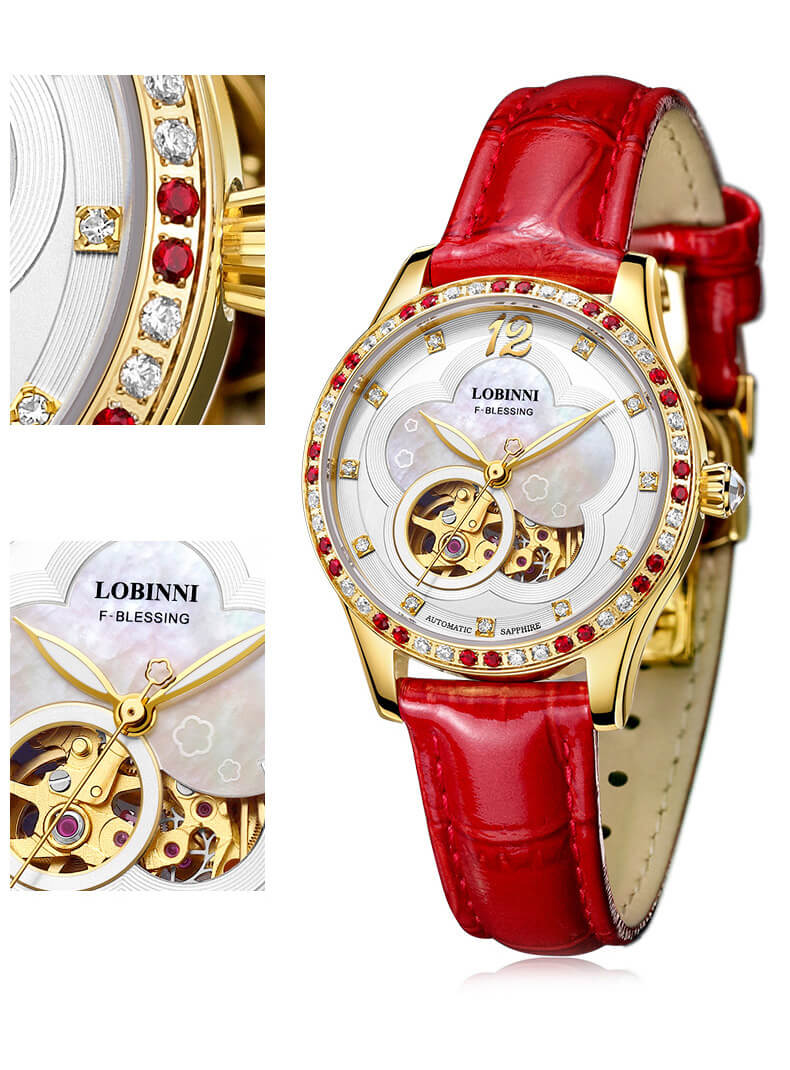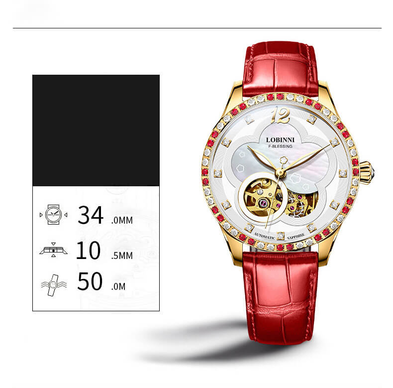 Nhãn hiệu LOBINNI Mã sản phẩm No.2007L Giới tính Nữ Kiểu máy Đồng hồ cơ (Automatic) Đường kính mặt 34 mm Độ dày 10,5 mm Chất liệu vỏ Thép không gỉ 316L Chất liệu dây Dây da cao cấp Chất liệu mặt kính Sapphire