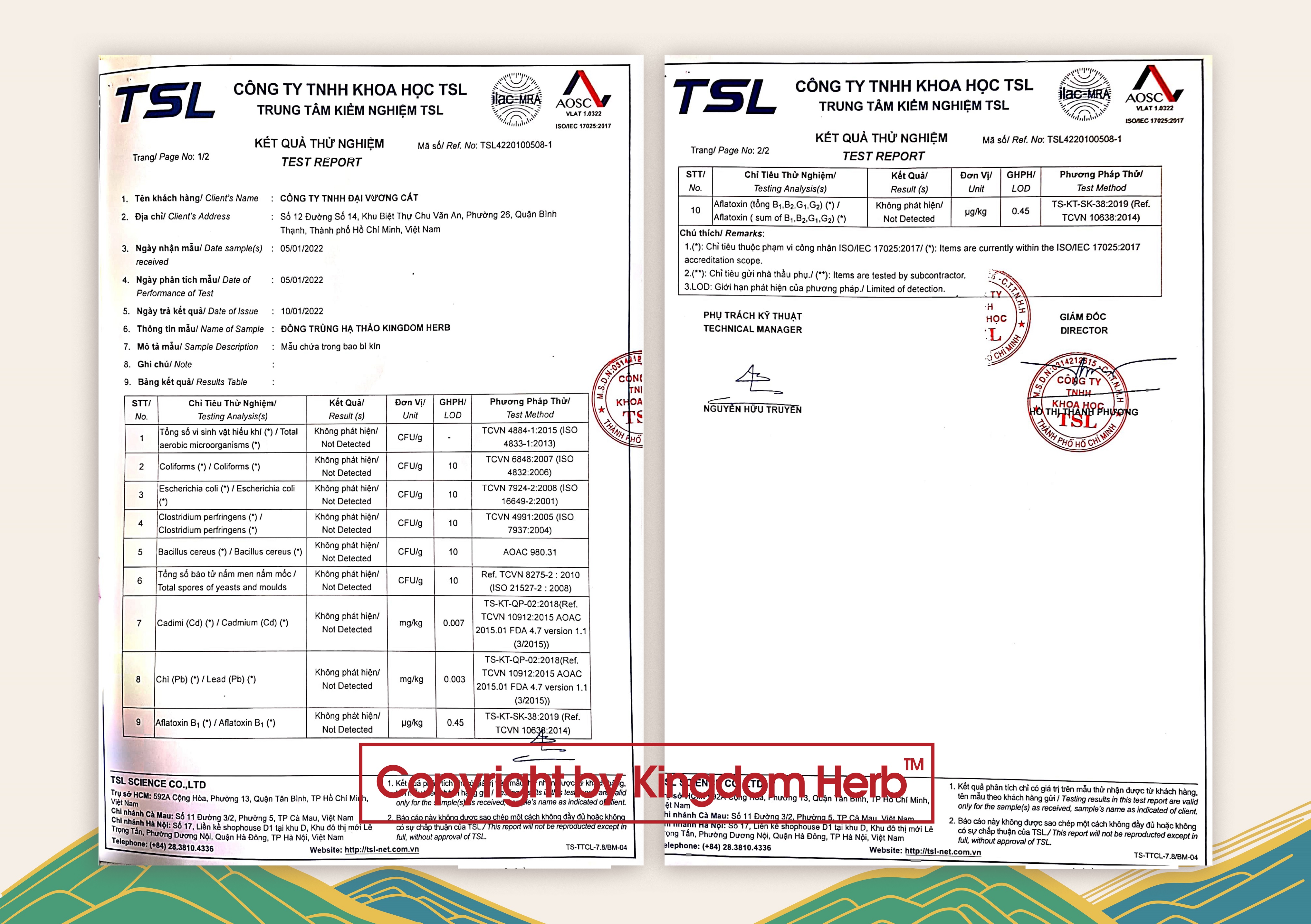 - Đông trùng hạ thảo khô Kingdom Herb được chứng nhận chất lượng tại trung tâm kiểm nghiệm TSL