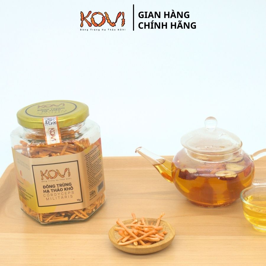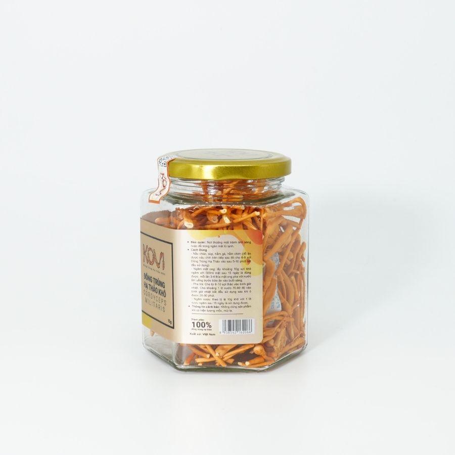 Đông Trùng Hạ Thảo khô KOVI 50g được đựng trong lọ thủy tinh cao cấp gồm thành phần 100% sợi đông trùng hạ thảo sấy thăng hoa.