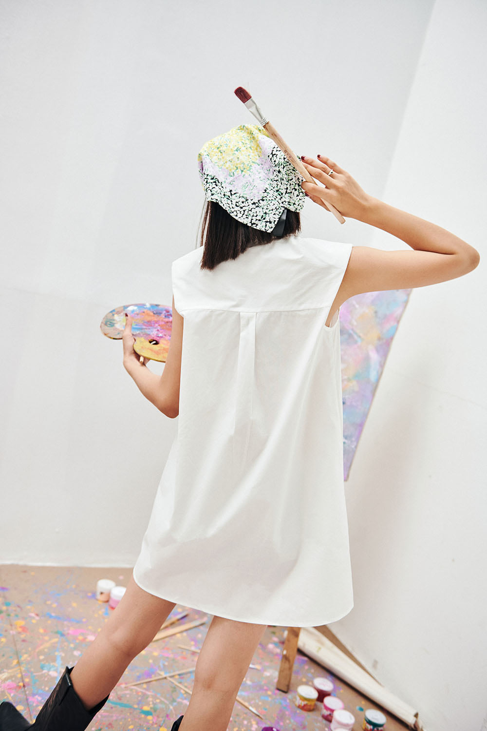 Đầm Sơ Mi Cotton, chất liệu cotton mềm mại, mỏng nhẹ. Phần trước ngực đính hạt tạo hình lá độc đáo. Mặc phối với quần short hoặc legging bên trong. Phom suông. Dài đầm 100cm