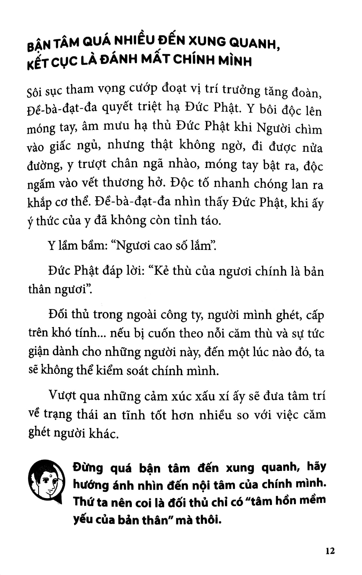 “Đức Phật” nơi công sở với các tranh minh họa được cắt ra từ Buddha. Từ các khung tranh và câu chuyện trích từ tác phẩm truyện tranh lừng danh “Đức Phật” của huyền thoại truyện tranh Nhật Bản, cũng là tác giả của cuốn sách này, Tezuka Osamu đã đưa ra những lời khuyên cho những vấn đề trong công việc và cuộc sống. Câu hỏi xuyên suốt cuốn sách là: Trên con đường giác ngộ, Đức Phật đã đối mặt và vượt qua những vấn đề quen thuộc trong cách làm việc và lối sống như thế nào, và chúng ta học được gì từ đó?