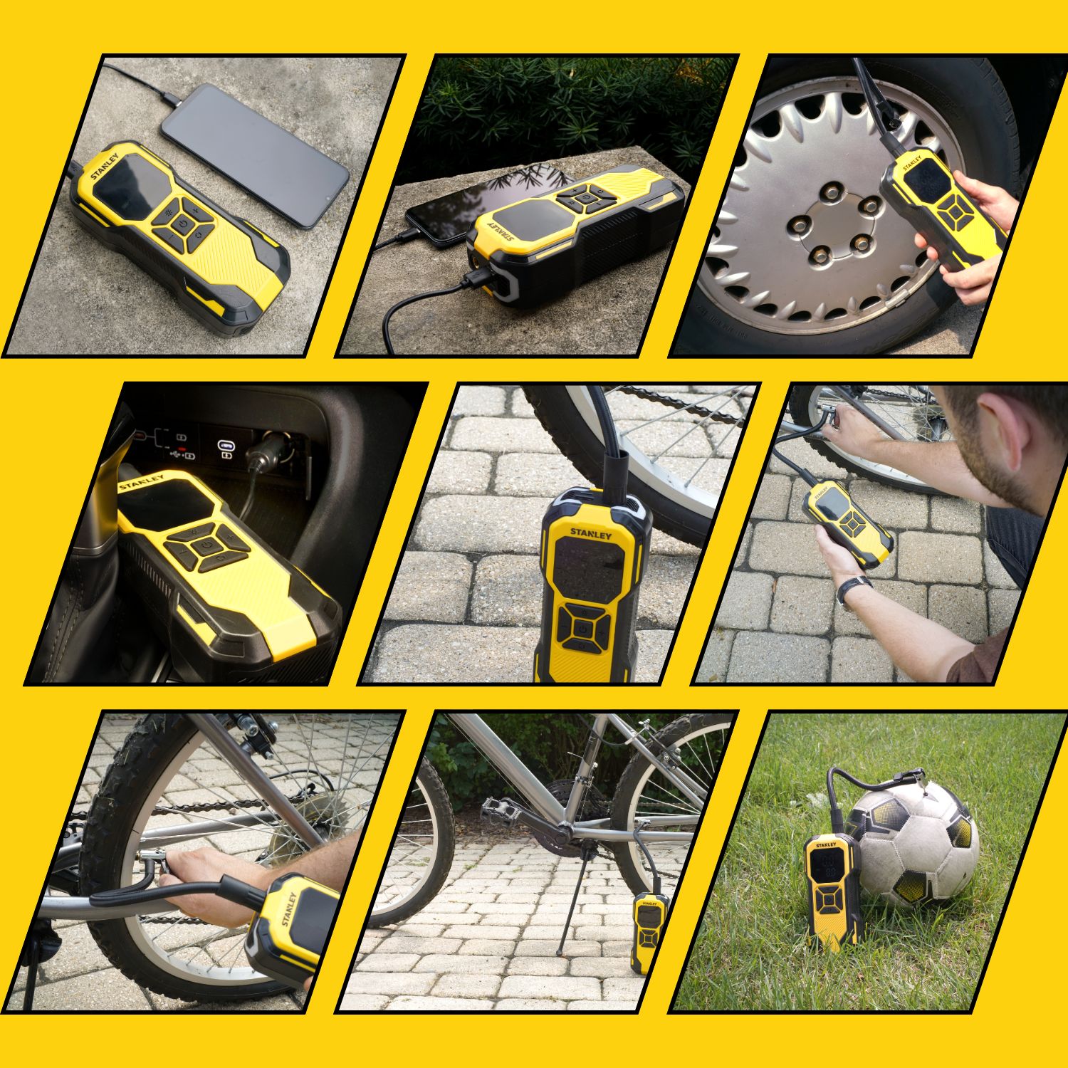 Dụng cụ đa năng bơm xe, đèn pin Led, sạc dự phòng STANLEY Model SXIF0101 Tiêu chuẩn Châu Âu