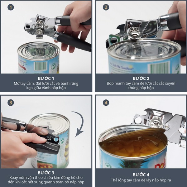 Chỉ với vài thao tác cực kì đơn giản, dụng cụ khui hộp Benchusch sẽ giúp ‘bật tung’ và ‘mở toang’ tất cả các nắp hộp/lon/chai được tìm thấy trong gian bếp nhà bạn.