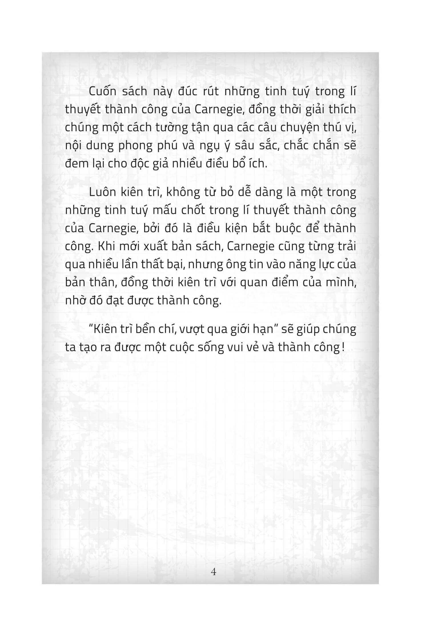 Trong bối cảnh như vậy, chúng ta cần học hỏi kinh nghiệm của người đi trước để có thể phát triển tốt hơn, nâng cao tố chất tự thân, khiến bản thân thực hiện được những mục tiêu to lớn hơn trong cuộc đời. Cuốn sách này đúc rút những tinh tuý trong lí thuyết thành công của Carnegie, đồng thời giải thích chúng một cách tường tận qua các câu chuyện thú vị, nội dung phong phú và ngụ ý sâu sắc, chắc chắn sẽ đem lại cho độc giả nhiều điều bổ ích. Luôn kiên trì, không từ bỏ dễ dàng là một trong những tinh tuý mấu chốt trong lí thuyết thành công của Carnegie, bởi đó là điều kiện bắt buộc để thành công. Khi mới xuất bản sách, Carnegie cũng từng trải qua nhiều lần thất bại, nhưng ông tin vào năng lực của bản thân, đồng thời kiên trì với quan điểm của m.ình, nhờ đó đạt được thành công. “Kiên trì bền chí, vượt qua giới hạn” sẽ giúp chúng ta tạo ra được một cuộc sống vui vẻ và thành công!
