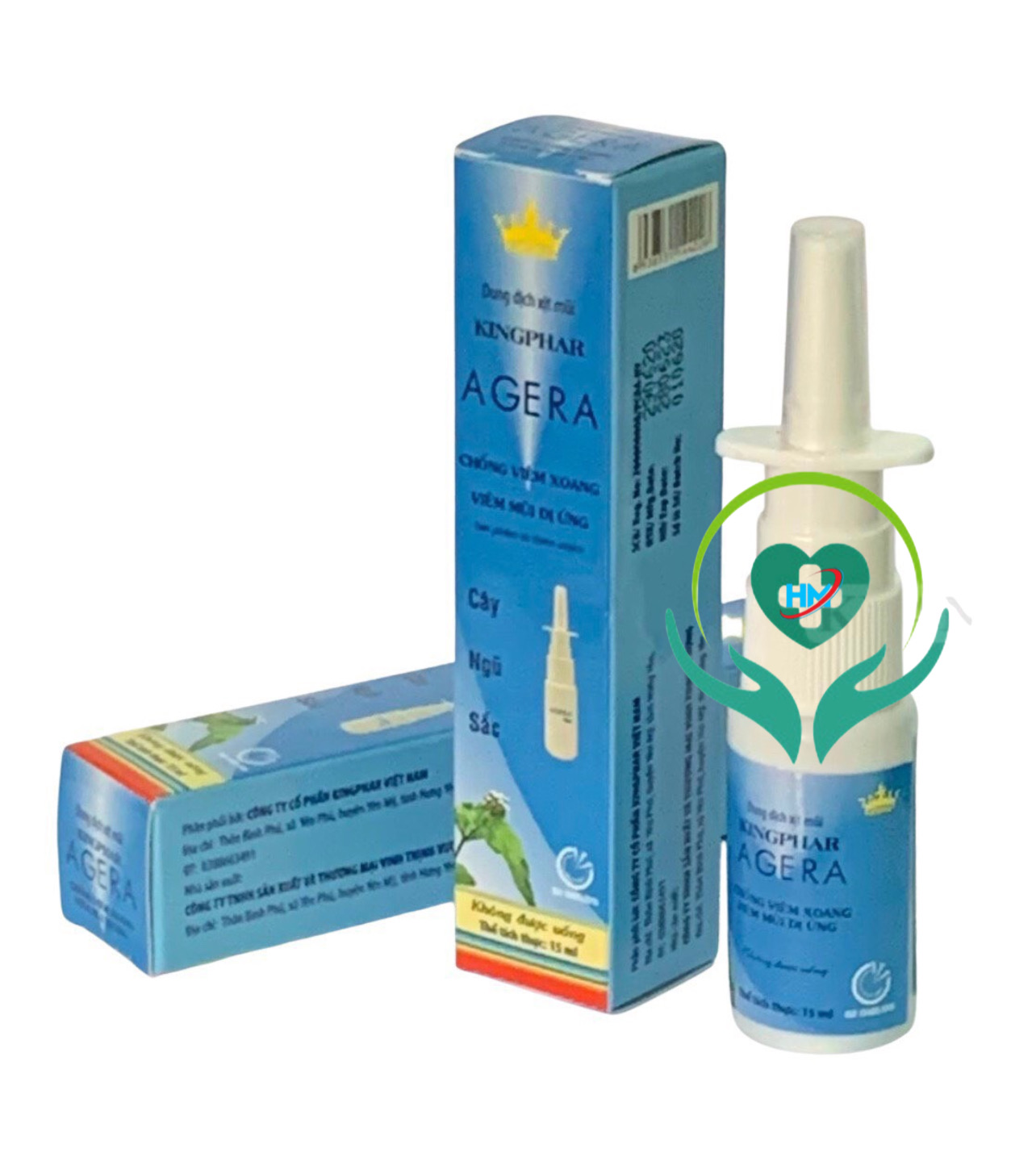 - CÁCH DÙNG Khi dùng lần đầu, mở nắp xịt cầm lọ thẳng đứng xịt vào không khí 2-3 lần đến khi đạt được độ xịt mạnh, đồng thời hít nhẹ để thuốc đi sâu vào khoang mũi. Khi xịt xong nên nằm ngửa, đầu hạ thấp xuống để dung dịch đi sâu vào các hốc xoang mũi sau đó xì bỏ dịch đã nhiễm khuẩn ra ngoài. Lưu ý: Người bị viêm xoang, viêm mũi dị ứng nên thường xuyên vệ sinh xoang mũi bằng nước muối sinh lí ấm, sau đó xịt dung dịch cây cứt lợn AGERA kết hợp với viên uống AGERA của công ty Kingphar để đạt hiệu quả tốt nhất. Dung dịch xịt agera thường gây xót nhất là với người bị viêm xoang mũi nặng, không nên dùng cho trẻ em dưới 5 tuổi. Hạn dùng: 36 tháng kể từ ngày sản xuất. Bảo quản: – Bảo quản nơi khô mát, tránh ánh nắng mặt trời. – Không dùng cho phụ nữ có thai và cho con bú. * LƯU Ý : Sản phẩm này không phải là thuốcvà không có tác dụng thay thế thuốcchữabệnh. Bảo quản : Nơi khô ráo, thoáng mát, tránh ánh sáng. **XUẤT XỨ VÀ THƯƠNG NHÂN CHỊU TRÁCH NHIỆM VỀ CHẤT LƯỢNG HÀNG HÓA CÔNG TY CỔ PHẦN KINGPHAR VIỆT NAM Thôn Bình Phú, Xã Yên Phú, Huyện Yên Mỹ, Tỉnh Hưng Yên, Việt Nam