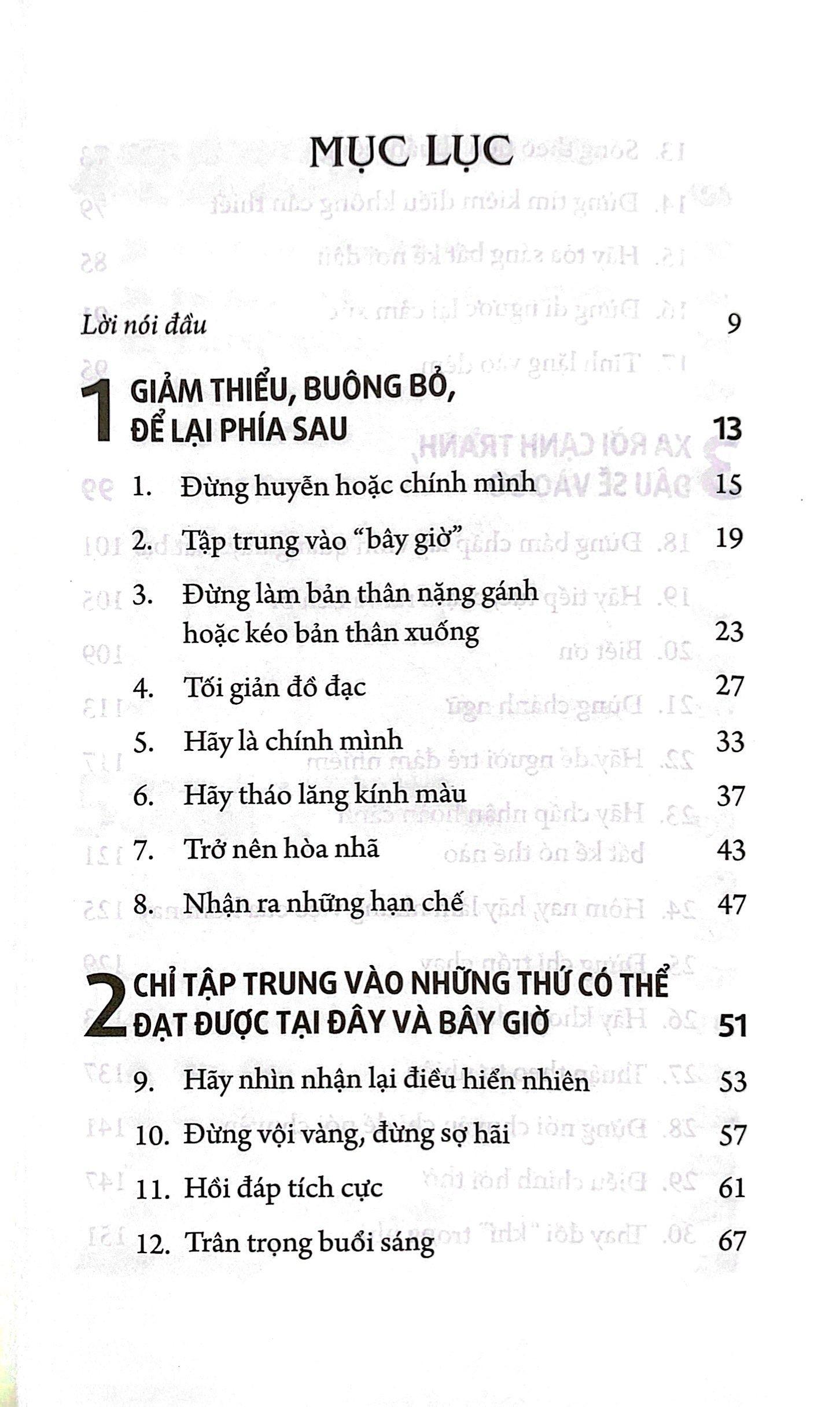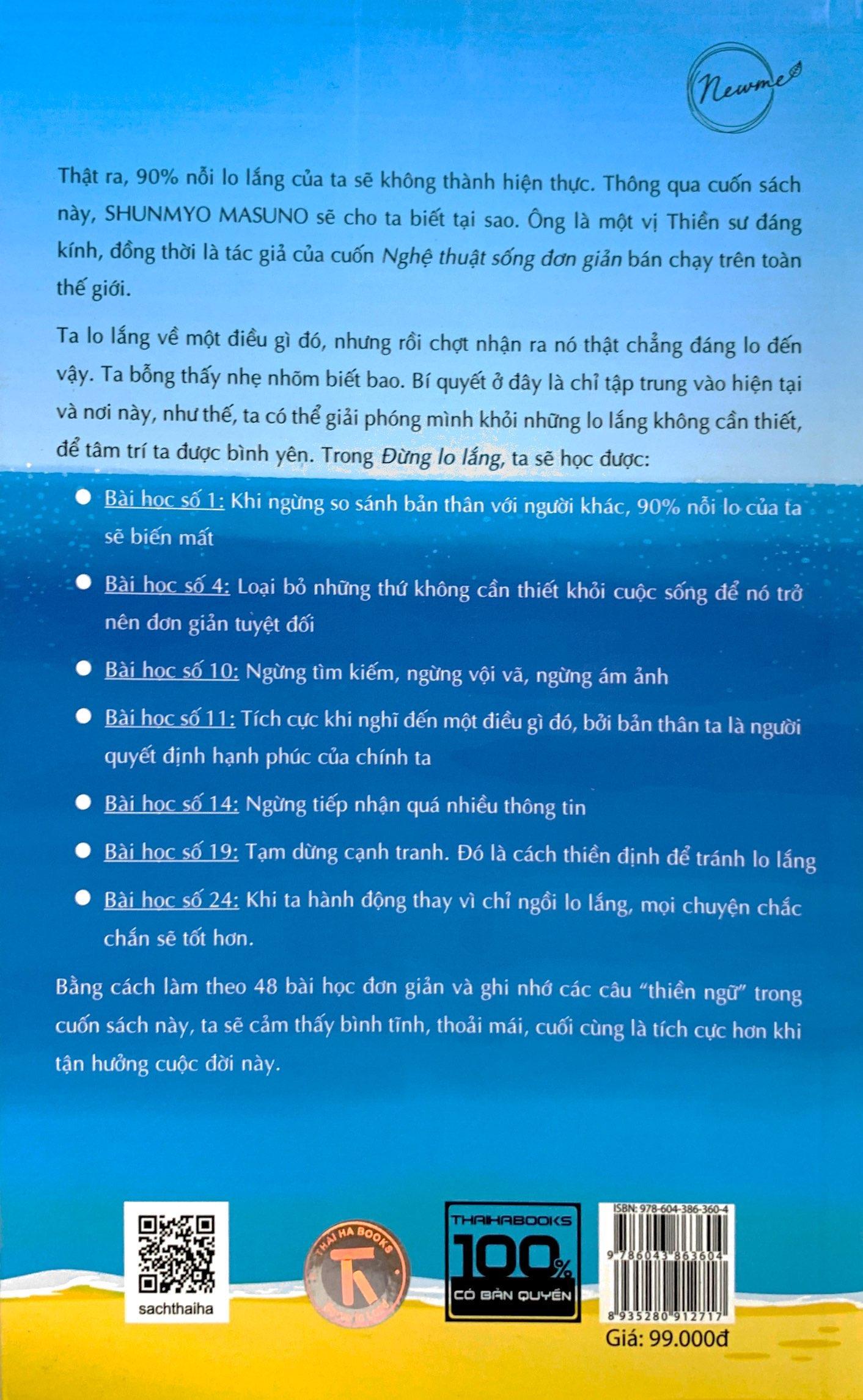 Ta lo lắng về một điều gì đó, nhưng rồi chợt nhận ra nó thật chẳng đáng lo đến vậy. Thật ra, 90% nỗi lo lắng của ta sẽ không thành hiện thực. Ta bỗng thấy nhẹ nhõm biết bao. Bí quyết ở đây là chỉ tập trung vào hiện tại và nơi này, như thế, ta có thể giải phóng m.ình khỏi những lo lắng không cần thiết, để tâm trí ta được bình yên. Thông qua cuốn sách này, SHUNMYO MASUNO sẽ cho ta biết tại sao. Bằng cách làm theo 48 bài học đơn giản và ghi nhớ các câu “thiền ngữ” trong cuốn sách này, ta sẽ cảm thấy bình tĩnh, thoải mái, cuối cùng là tích cực hơn khi tận hưởng cuộc đời này. Thông tin tác giả: Shunmyo Masuno là một vị Thiền sư đáng kính, đồng thời là tác giả của cuốn Nghệ thuật sống đơn giản bán chạy trên toàn thế giới. Thiền sư Shunmyo Masuno là tác giả của nhiều cuốn Thái Hà Books đã xuất bản: Sống đơn giản cho đời thanh thản, Thiền ngữ giản đơn, Cứ an nhiên rồi sẽ bình yên,… Mục lục: 1 GIẢM THIỂU, BUÔNG BỎ, ĐỂ LẠI PHÍA SAU Đừng huyễn hoặc chính m.ình Tập trung vào “bây giờ” Đừng làm bản thân nặng gánh hoặc kéo bản thân xuống Tối giản đồ đạc Hãy là chính m.ình Hãy tháo lăng kính màu Trở nên hòa nhã Nhận ra những hạn chế 2 CHỈ TẬP TRUNG VÀO NHỮNG THỨ CÓ THỂ ĐẠT ĐƯỢC TẠI ĐÂY VÀ BÂY GIỜ Hãy nhìn nhận lại điều hiển nhiên Đừng vội vàng, đừng sợ hãi Hồi đáp tích cực Trân trọng buổi sáng Sống theo tiêu chuẩn riêng Đừng tìm kiếm điều không cần thiết Hãy tỏa sáng bất kể nơi đâu Đừng đi ngược lại cảm xúc Tĩnh lặng vào đêm 3 XA RỜI CẠNH TRANH, ĐÂU SẼ VÀO ĐÓ Đừng bám chấp lấy vinh quang hay thất bại Hãy tiếp tục, chậm rãi và bền bỉ Biết ơn Dùng chánh ngữ Hãy để người trẻ đảm nhiệm Hãy chấp nhận hoàn cảnh bất kể nó thế nào Hôm nay, hãy làm những việc của hôm nay Đừng chỉ trốn chạy Hãy khoan dung Thuận theo tự nhiên Đừng nói chuyện chỉ để nói chuyện Điều chỉnh hơi thở Thay đổi “khí” trong nhà 4 MỘT SỐ MẸO MỚI LẠ GIÚP CẢI THIỆN CÁC MỐI QUAN HỆ Trân trọng những kết nối Xây dựng những mối quan hệ tốt đẹp Nhường người khác Đừng chạy theo “logic” Dành mười phút mỗi ngày giữa thiên nhiên Khiến người muốn gặp lại ta Nhận lỗi ngay Đừng ngại nhờ giúp đỡ Hãy là người biết lắng nghe Đừng quyết định dựa trên được và mất 5 THAY ĐỔI CÁCH LO LẮNG, CUỘC SỐNG SẼ TƯƠI ĐẸP HƠN Tiền bạc Già đi Tuổi già Tình yêu Hôn nhân Con cái Cái chết Hồi kết của một người Trích đoạn nội dung: NHẬN LỖI NGAY Hãy truyền tải lời xin lỗi cùng cảm xúc chứ không chỉ bằng lời nói Bạn đã từng xích mích với bạn bè của m.ình chưa? Một tình bạn lâu dài nhất định có bất hòa hoặc hiểu lầm. Những điều này có thể dẫn đến rạn nứt. Tôi rất ngạc nhiên nếu giữa những người bạn thân thiết không có một cuộc chiến nào. Quan trọng làcách xử lý và hòa giải. Nếu bất cẩn, ta có thể phá vỡmối quan hệ bản thân đã vất vả tạo dựng. Để một hiểu lầm hoặc lời xin lỗi vụng về phá vỡ một mối quan hệ thật sự thật đáng tiếc. Không quá lời khi nói cuộc sống sẽ kém sôi động hơn khi thiếu vắng mối quan hệ đó. “Quá tắc vật đạn cải (có lỗi thì chớ ngại sửa đổi).” Đây là một câu nói nổi tiếng trong sách Luận Ngữ của Khổng Tử, nhưng áp dụng nó vào thực tế có thể rất khó khăn. Ngay cả khi nhận ra chính điều bản thân đã làm gây ra vấn đề, vì lý do nào đó, ta vẫn ngại xin lỗi. Thể hiện sự hối hận với một người bạn tốt có thật sự khó không? Về điều này, Luận Ngữ nói: “Quá nhi bất cải, thị vị quá hĩ (có lỗi mà không sửa, đấy mới thật là có lỗi).” Làm sai và không xin lỗi chính là một cái sai. Trong khi ta vật lộn với câu hỏi liệu có cần xin lỗi hoặc xin lỗi như thế nào, tình hình đang càng trở nên phức tạp và ta có nguy cơ không thể sửa chữa mối quan hệ này nữa. Lời xin lỗi luôn phải ngay lập tức và trực tiếp. Việc gì càng để lâu càng khó giải quyết. Việc xin lỗi cũng không khác gì. Ngay cả khi nói xin lỗi ngay lập tức nhưng không có bất kỳ cố gắng hòa giải nào, thời gian càng trôi đi thì càng khó hòa giải hơn. Không khó hình dung người kia cảm thấy thế nào. “Anh ta xin lỗi ngay lập tức. Có vẻ như anh ta không có ý đó” sẽ trở thành “Anh ta làm sao vậy? Liệu anh ta có nhận ra bản thân đã làm tổn thương không?” sau đó là “Mình chưa từng nghĩ anh ta là loại người đó” và cuối cùng “Đúng là tên khốn! Không thể tin m.ình đã làm bạn với hắn lâu thế này!”. Quan trọng là lời xin lỗi phải được thực hiện trực tiếp. Trong Thiền có từ menju, nghĩa là “mặt đối mặt”. Nó chỉ cuộc gặp mặt trực tiếp giữa sư phụ và đệ tử, vì những giáo lý quan trọng của nhà Phật được truyền thụ không phải bằng kinh sách hay văn tự mà là trực tiếp, khi những người liên quan đều có mặt. Việc này áp dụng được hoàn hảo