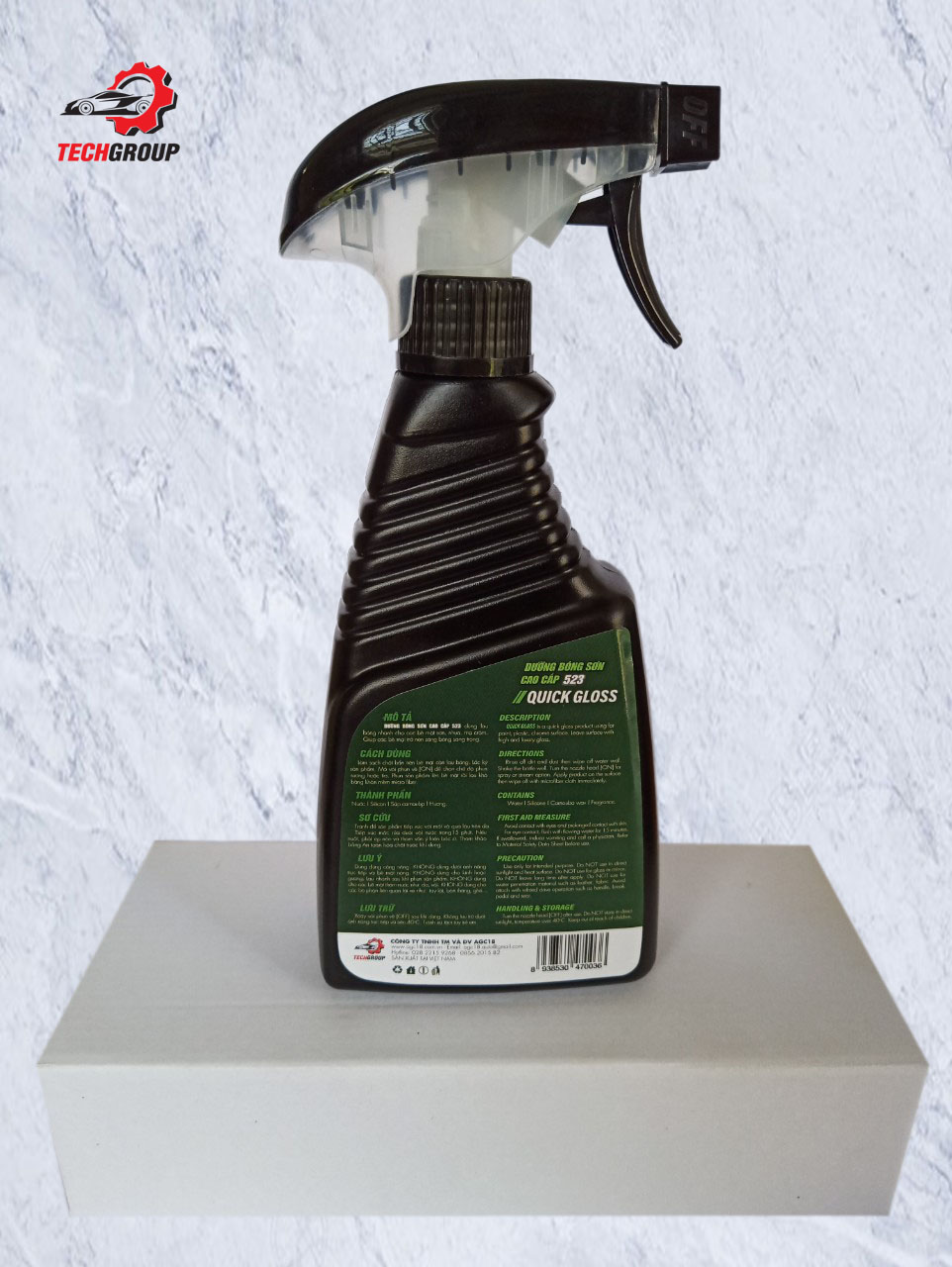 Dưỡng bóng sơn cao cấp Techgroup – 523 dùng lau bóng nhanh cho các bề mặt sơn, nhựa, mạ crôm. Giúp các bề mặt trở nên sáng bóng sang trọng. 1.  Tính Năng : – Dễ lau chùi: Một lớp sơn bóng trên bề mặt sơn sẽ giúp việc lau chùi, dọn dẹp vết bẩn trở nên dễ dàng hơn. . Chỉ cần lấy khăn lau nhẹ, vết bẩn có thể trôi đi, với những vết bẩn cứng đầu có thể dùng thêm dung dịch vệ sinh chuyên dụng. – Chống bám bụi: Độ láng mịn của sơn bóng sẽ giúp bề mặt sơn giảm ma sát, là lợi thế để bụi bẩn không thể bám lại. – Chống nấm mốc: Bề mặt bóng loáng của loại sơn này sẽ giúp bề mặt sơn không bị ẩm mốc. – Làm mới và tăng thẩm mỹ: Đây chắc chắn là công dụng khiến nhiều người thích dùng sơn bóng, bởi nó giúp bề mặt trở nên tươi sáng, có sức hấp dẫn và bền màu hơn. 2. Hướng dẫn sử dụng: Làm sạch chất bẩn trên bề mặt cần lau bóng. Lắc kỹ sản phẩm. Mở vòii phun về[ON] để chọn chế độ phun sương hoặc tia. Phun sản phẩm lên bề mặt rồi lau khô bằng khăn mềm microfiber. 3. Thành phần : Nước, silicon, sáp carnauba, hương. 4. Sơ cứu : Tránh để sản phẩm tiếp xúc với mắt và quá lâu trên da.Tiếp xúc mắt: rửa dưới vòi nước trong15 phút. Nếu nuốt, phải ép nôn và tham vấn ý kiến bác sĩ. Tham khảo bảng An toàn hóa chất trước khi dùng. 5. Lưu ý :