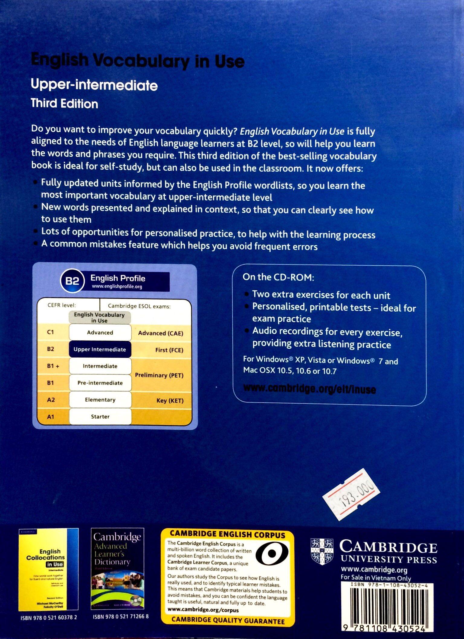 Mua tại TiktokEnglish Vocabulary in Use: Upper-intermediate is the third level of four in the family of best-selling vocabulary reference and practice books, ideal for self-study or classroom use. Vocabulary explanations and practice for upper-intermediate level (B2) learners of English. Perfect for both self-study and classroom activities. Quickly expand your vocabulary with over 100 units of easy to understand explanations and practice exercises. Be confident about what you are learning, thanks to Cambridge research into how English is really spoken and written, and get better at studying by yourself, with units on learning vocabulary, personalised practice and an easy to use answer key .