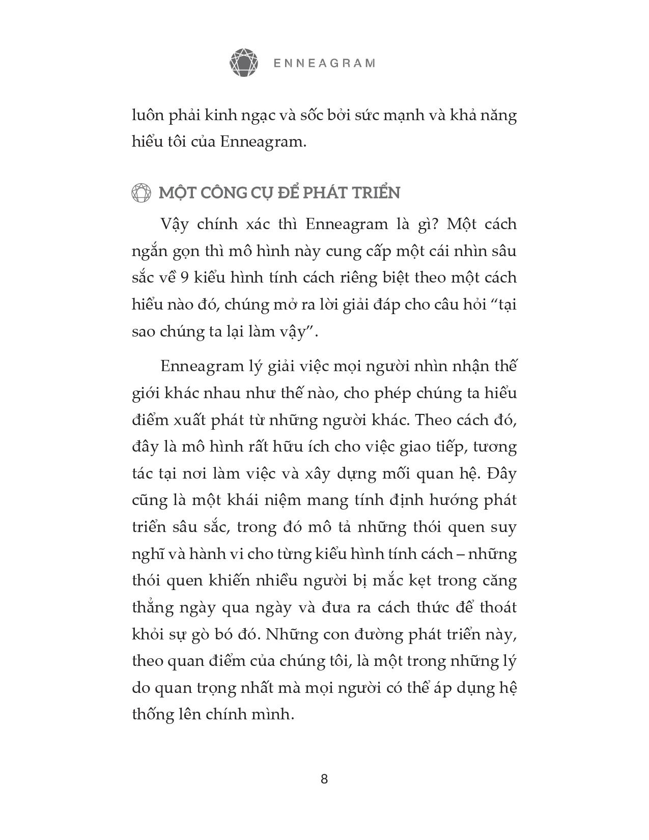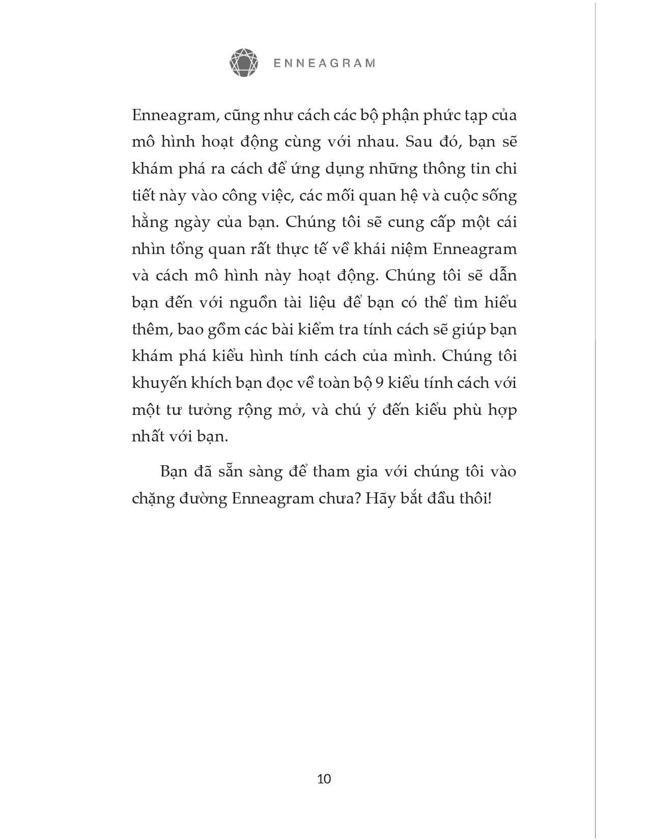 Cuốn sách cung cấp cho bạn một các nhìn tổng quan rất thực tế về khái niệm Enneagram và cách mô hình này hoạt động. Nó sẽ dẫn bạn đến với nguồn tài liệu để bạn có thể tìm hiểu thêm, bao gồm các bài kiểm tra tính cách mà sẽ giúp bạn khám phá được kiểu hình tính cách của chính mình. Từ đó bạn sẽ khám phá ra cách để ứng dụng những thông tin vào công việc, các mối quan hệ và cuộc sống hằng ngày của bạn.