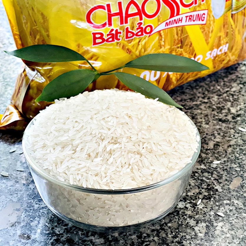 - Thành phần: Gạo Bát Bảo Minh Trung có đặc tính thơm, hạt cơm trắng, mềm dẻo, tơi xốp, có vị ngọt dịu nhẹ và đặc biệt vẫn ngon khi để nguội.