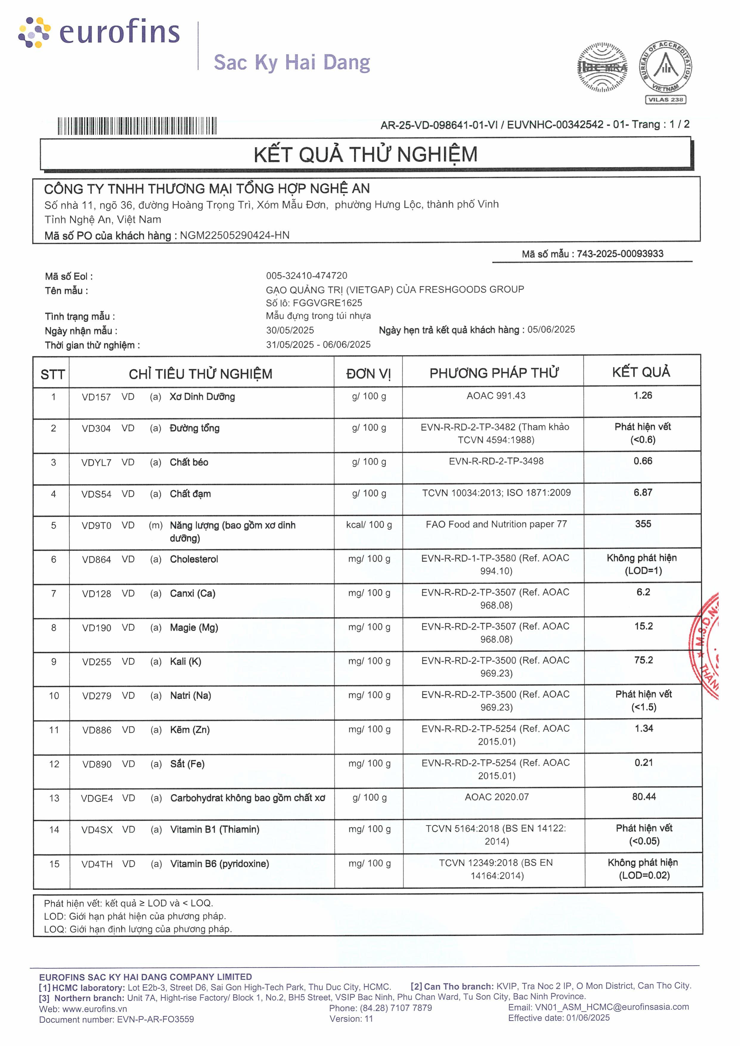 - Đảm bảo an toàn vệ sinh thực phẩm cao: Kiểm soát kim loại nặng đều nằm trong giới hạn an toàn. Không độc tố nấm mốc và dư lượng thuốc trừ sâu: Các độc tố như Ochratoxin A, Aflatoxin B1 và Aflatoxin tổng đều "Không phát hiện" (<0.5 µg/kg). Các chỉ tiêu về thuốc bảo vệ thực vật và Glufosinat-amoni cũng đều "Không phát hiện", cho thấy sản phẩm được kiểm soát nghiêm ngặt về hóa chất nông nghiệp và độc tố.