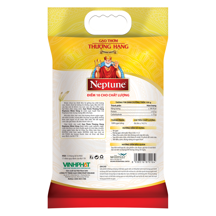 Gạo Thơm Thượng Hạng Neptune Nhãn Vàng 5kgGạo Thơm Thượng Hạng Neptune Nhãn Vàng 5kg được sản xuất từ những giống lúa chất lượng cao vùng Đồng Bằng Sông Cửu Long. Hạt gạo dài, trắng ngà, ít gãy, có m...