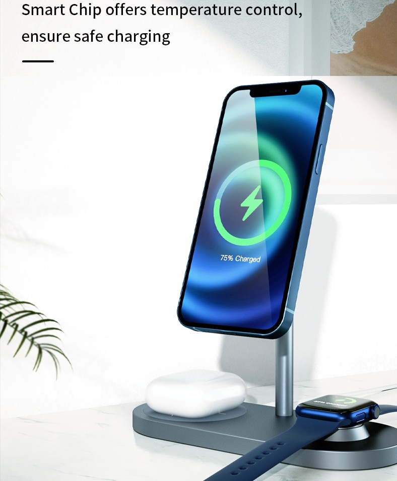 Lực hút nam châm tăng 20% so với các sản phẩm thông thường, giữ chặt thiết bị tương thích ngay cả khi di chuyển. Bạn có thể sạc ba thiết bị cùng lúc với một