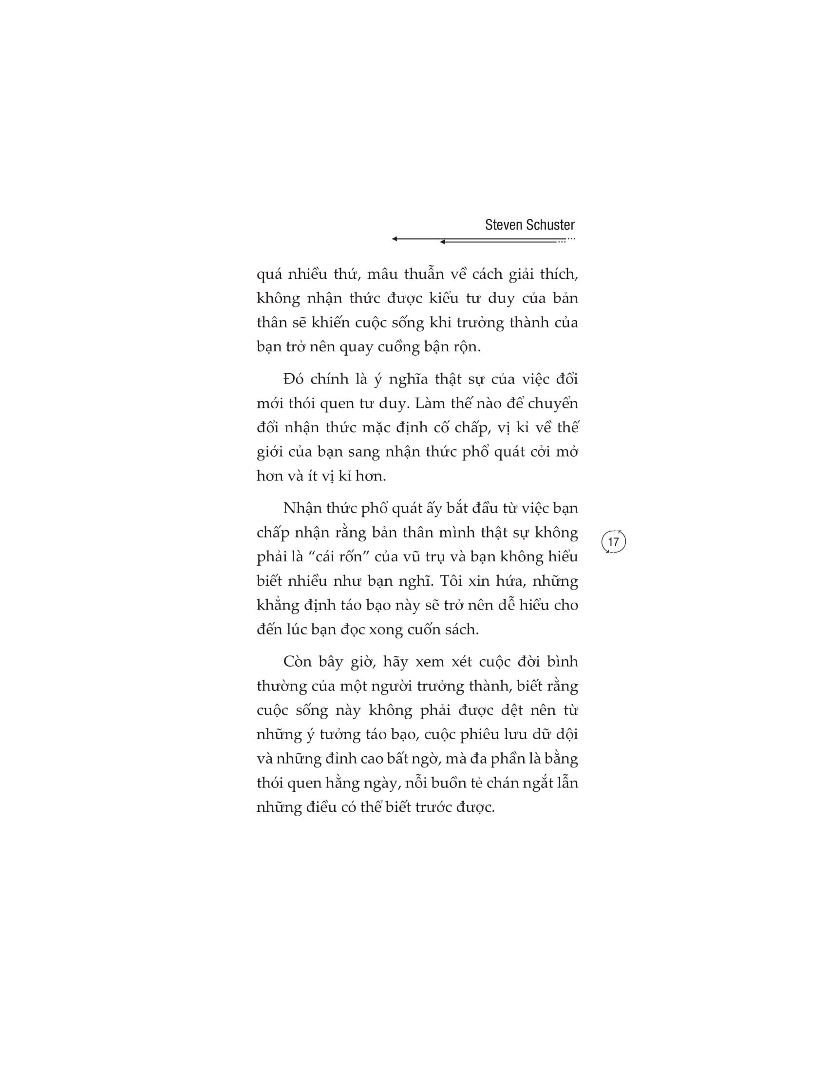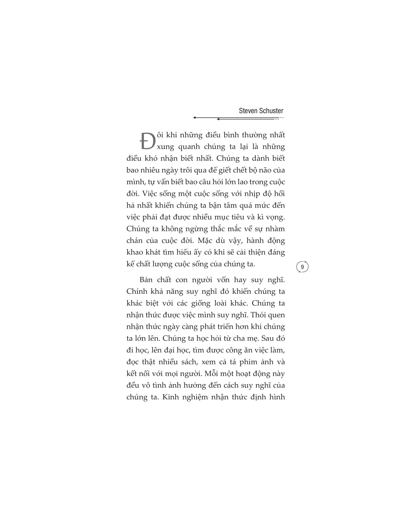 “Bản chất con người vốn hay suy nghĩ. Chính khả năng suy nghĩ đó khiến chúng ta khác biệt với các giống loài khác. Chúng ta nhận thức được việc mình suy nghĩ. Thói quen nhận thức ngày càng phát triển hơn khi chúng ta lớn lên. Chúng ta học hỏi từ cha mẹ. Sau đó đi học, lên đại học, tìm được công ăn việc làm, đọc thật nhiều sách, xem cả tá phim ảnh và kết nối với mọi người. Mỗi một hoạt động này đều vô tình ảnh hưởng đến cách suy nghĩ của chúng ta. Kinh nghiệm nhận thức định hình thế giới quan của mỗi người. Mọi thứ mà cá nhân chúng ta trải nghiệm sẽ đi qua bộ lọc của bản thân và được hợp thức hóa. Rất thực tế. Còn thực tế hơn cả những thứ chúng ta chưa từng trải qua. Cho dù những điều chúng ta tin có thể không phải lúc nào cũng đúng.”