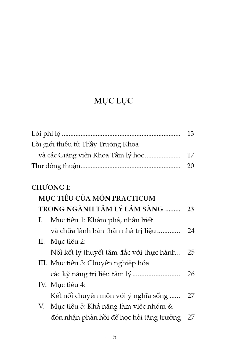 - đào tạo nhà trị liệu tương lai trở thành người lắng nghe thấu cảm, biết nhạy bén để nhận thức được nhu cầu của bản thân và của người khác, hầu có thể xây dựng sự an toàn, tôn trọng, cẩn mật, kiên nhẫn…. Nhà trị liệu tương lai cần ý thức rõ không những điểm mạnh mà cả điểm yếu của bản thân, khả năng nhìn ra ánh sáng nơi tăm tối, đọc được những gì không được nói ra bằng lời của tha nhân, người vừa biết cởi mở để lắng nghe với sự hiện diện ấm áp, an toàn, đồng thời thể hiện được tính chuyên nghiệp, tính bảo mật, trong khi đó biết chia sẻ thông tin đúng lúc, biết ghi chú những dịch chuyển của thân chủ trong phiên trị liệu và biết lưu giữ hồ sơ lâm sàng, người lưu tâm đến vấn đề đạo đức, nhạy bén để trao quyền cho thân chủ, nhưng không tìm cách thoái thác trách nhiệm, người có khả năng biết tự chăm sóc và hài lòng với những gì mình đã làm tốt nhất. Đây là nỗ lực của học viên để chia sẻ với các lớp sau, những suy tư được kết nối giữa cơ sở lý thuyết tâm lý với kinh nghiệm sống rất cá nhân, những gập ghềnh và những thành tựu trên hành trình trở thành nhà trị liệu tương lai. Chúng tôi trân trọng gửi đến người đọc tập sách này, được chắt lọc từ suy tư của học viên cao học, liên quan đến môn thực hành tâm lý lâm sàng. Sách đã được người hướng dẫn phản hồi, góp ý, ghi nhận và hiệu đính. Vì mục tiêu của tập sách này là chia sẻ kinh nghiệm học thuật, dưới sự hướng dẫn của giám sát chuyên môn, nên chúng tôi biết ơn sự trân trọng của độc giả. TPHCM, ngày 04/10/2022 Tiến sĩ Nguyễn Thị Thanh Tú, Fmm