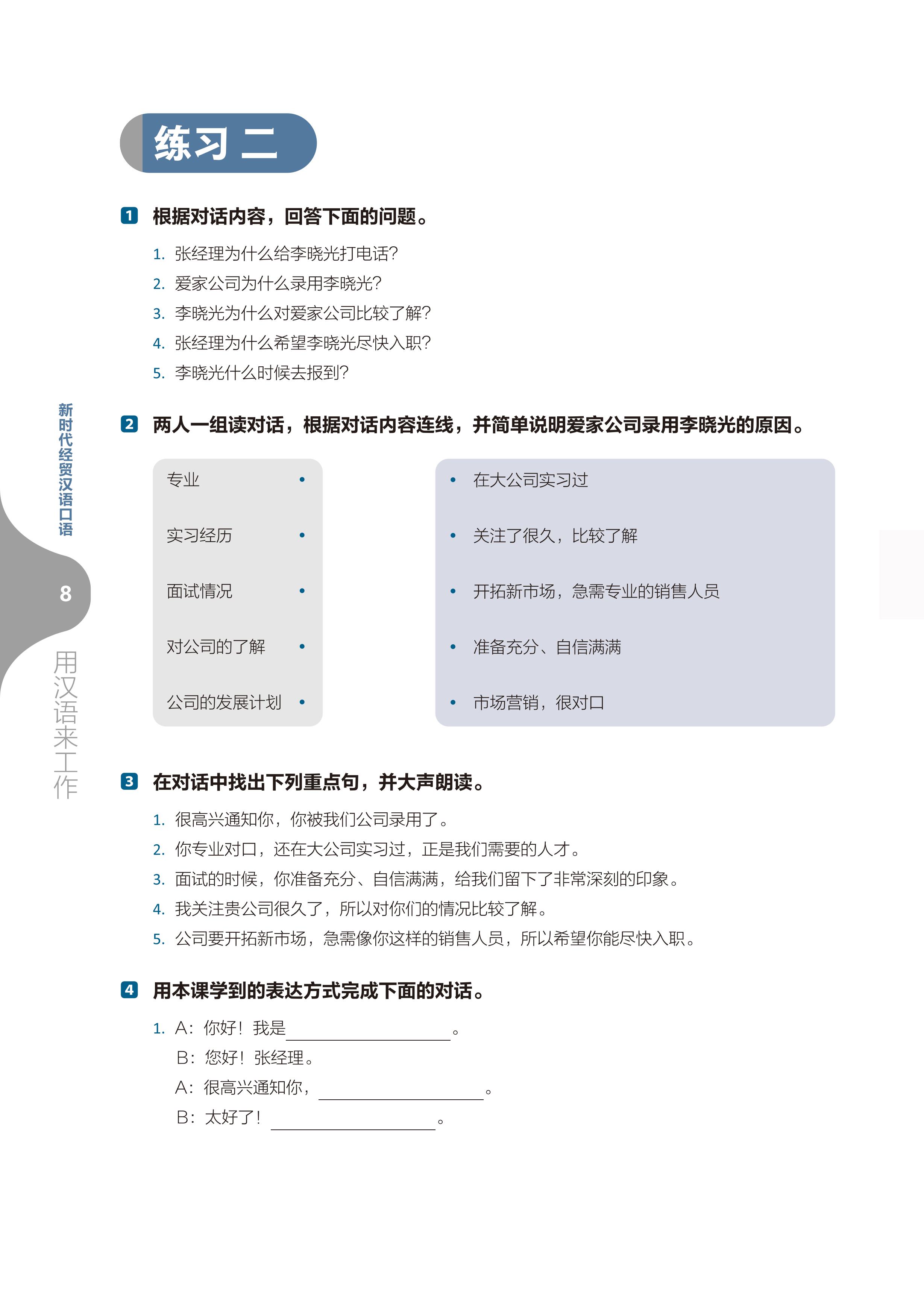 • Từ ngữ và Hội thoại: Nội dung cốt lõi của mỗi bài. Mỗi bài học hai đoạn hội thoại liên quan đến chủ đề bài học, thúc đẩy tình tiết câu chuyện phát triển, đồng thời nắm vững các từ ngữ trọng điểm liên quan, đặc biệt là các từ ngữ thường dùng trong môi trường kinh doanh.