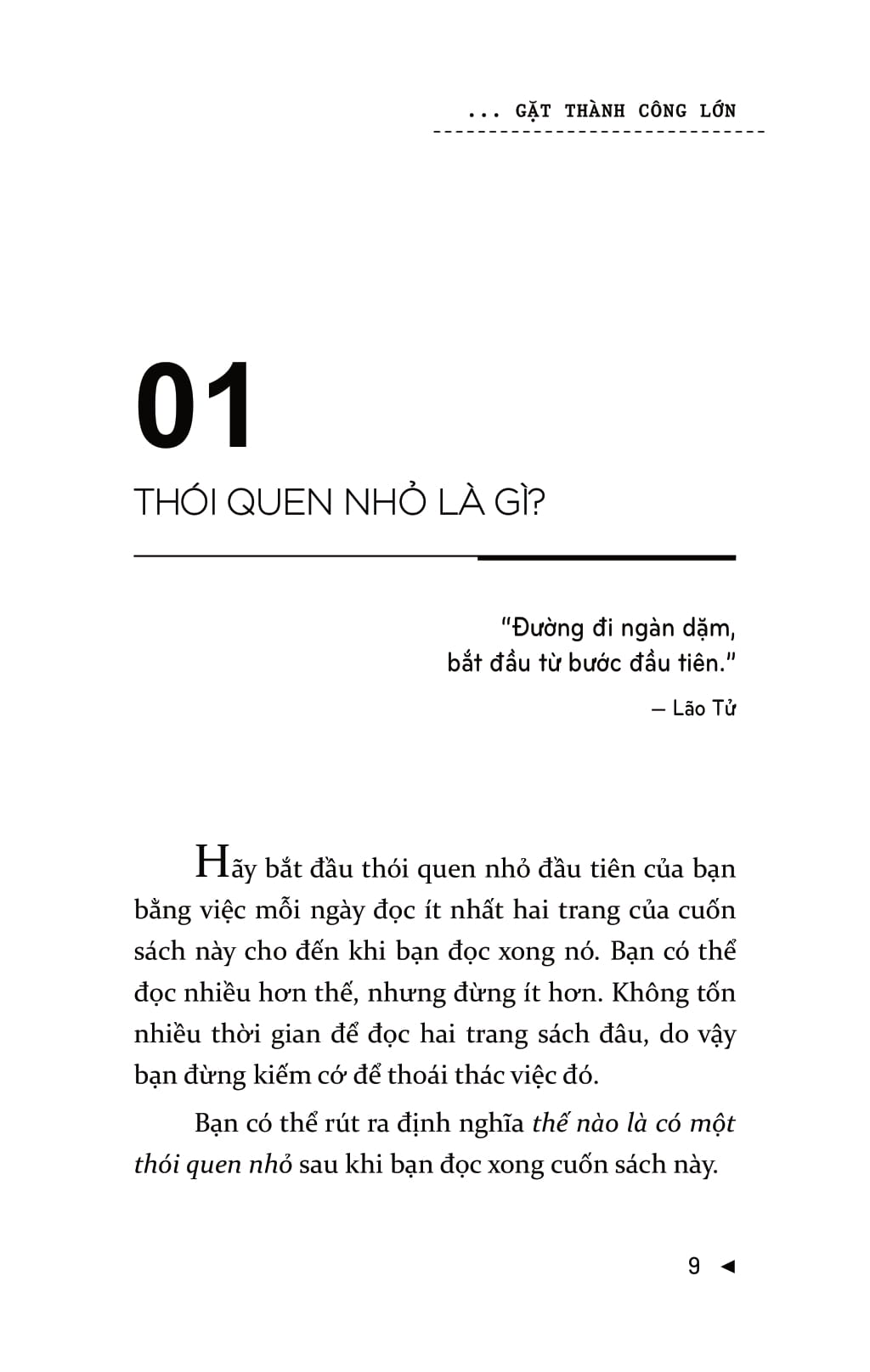 Mọi người thường nghĩ, chính họ là nguyên nhân khiến bản thân không thể đạt được sự thay đổi lâu dài. Nhưng vấn đề ở đây không phải là bản thân họ mà là chiến lược của họ. Bạn có thể đạt được những thành công to lớn mà không chịu bất cứ áp lực nào và sẽ không lặp lại thất bại nhờ những cách thức, phương pháp kiểu như: “lấy động lực”, sự kiên trì, và thậm chí là “làm đại đi”. Để đạt được những thay đổi lâu dài, bạn đừng cưỡng lại bộ não của mình. Khi bạn bắt đầu làm theo những chỉ thị của não bộ – theo dẫn dắt từ Gieo thói quen nhỏ gặt thành công lớn – thì những thay đổi tích cực, lâu dài sẽ không khó để đạt được! Gieo thói quen nhỏ gặt thành công lớn là cuốn sách khoa học tìm ra sự mâu thuẫn trong hầu hết các chiến lược phát triển bản thân và lý giải nguyên nhân tại sao các thói quen nhỏ lại tạo nên sự thống nhất rõ rệt. Một thói quen nhỏ là hành vi tích cực rất nhỏ mà bạn bắt bản thân phải làm mỗi ngày. Nó “quá nhỏ để thất bại” nhưng lại mạnh mẽ không thể lường trước và là một chiến lược góp phần hình thành nên thói quen ưu việt.Cuốn sách gồm có bảy phần chính. Ba phần đầu của cuốn sách bàn về việc xây dựng thói quen, bộ não, ý chí, động lực và chỉ ra cách chúng liên hệ với nhau. Hai phần tiếp theo bàn về các kết luận mang tính lô-gic và cách khai thác một cách khoa học nhất những thông tin cung cấp. Ba phần cuối hướng dẫn bạn áp dụng những cách thức đó trong cuộc sống.Chiến lược này sẽ giúp cuộc sống của bạn trở nên hoàn hảo hơn 99% số người sống trên hành tinh này.
