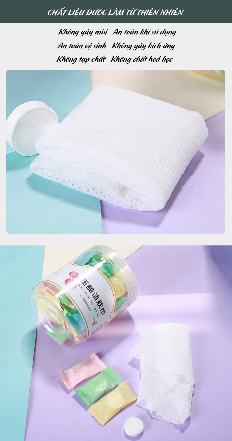Khăn nén dạng viên khăn mặt bông tinh khiết dùng một lần - Được làm từ bông tinh khiết 100% - Khăn mặt được nén dưới dạng viên kẹo nhỏ gọn, tiện lợi khi mang