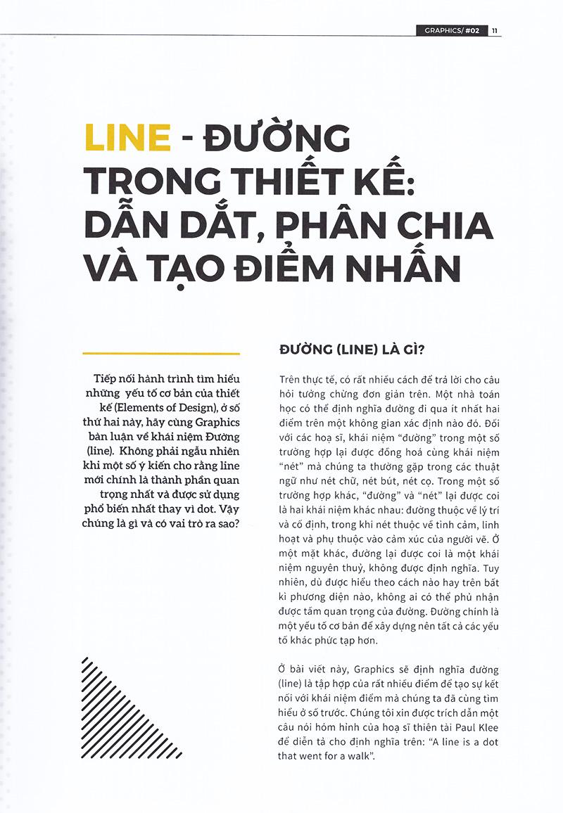 Số thứ hai của Graphics xoay quanh thành phần thiết kế cơ bản thứ hai: Line (đường). Những bài viết chuyên đề sẽ cung cấp cho bạn những khái niệm về Đường và chúng được sử dụng trong những bản thiết kế ra sao. Bên cạnh đó, chuyên mục Graphic - Illustration sẽ phân tích những xu hướng thiết kế nổi bật trong những năm vừa qua như Gradient và Line Art. Chuyên mục Branding - Packaging là tập hợp một số case study về các thương hiệu ứng dụng Line vào nhận diện và bao bì trên thực tế. Ngoài ra, nếu bạn quan tâm tới nhiếp ảnh hoặc muốn tìm kiếm những ý tưởng mới, chuyên mục Art & Inspiration sẽ giới thiệu loạt bài viết và trưng bày những tác phẩm nghệ thuật truyền cảm hứng dành cho bạn.