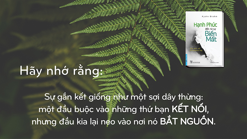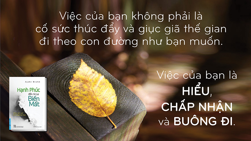 Đó là vì ta thường nghĩ đến mình và sợ mất đi những thứ “của mình”. Đối với Ajahn Brahm, chìa khóa để mở cánh cửa hạnh phúc vĩnh hằng và bình an chính là buông bỏ. Biến mất là dứt bỏ tất cả mọi thứ, không chuốc thêm vật chất hay giành giật địa vị. Khi ta dứt bỏ cái gì đó, dứt bỏ thật sự thì nó biến mất. Đó là sự biến mất từ trong ra ngoài, sự biến mất của cái tôi – bản ngã. Dứt bỏ cái tôi thì ta dứt bỏ được tất cả phù phiếm, ảo ảnh bên ngoài; dứt bỏ được những nỗi đau, lo lắng thua thiệt đi kèm nó. Từ đó, ta tìm được bình yên thực sự, tìm được niềm hạnh phúc bất diệt.