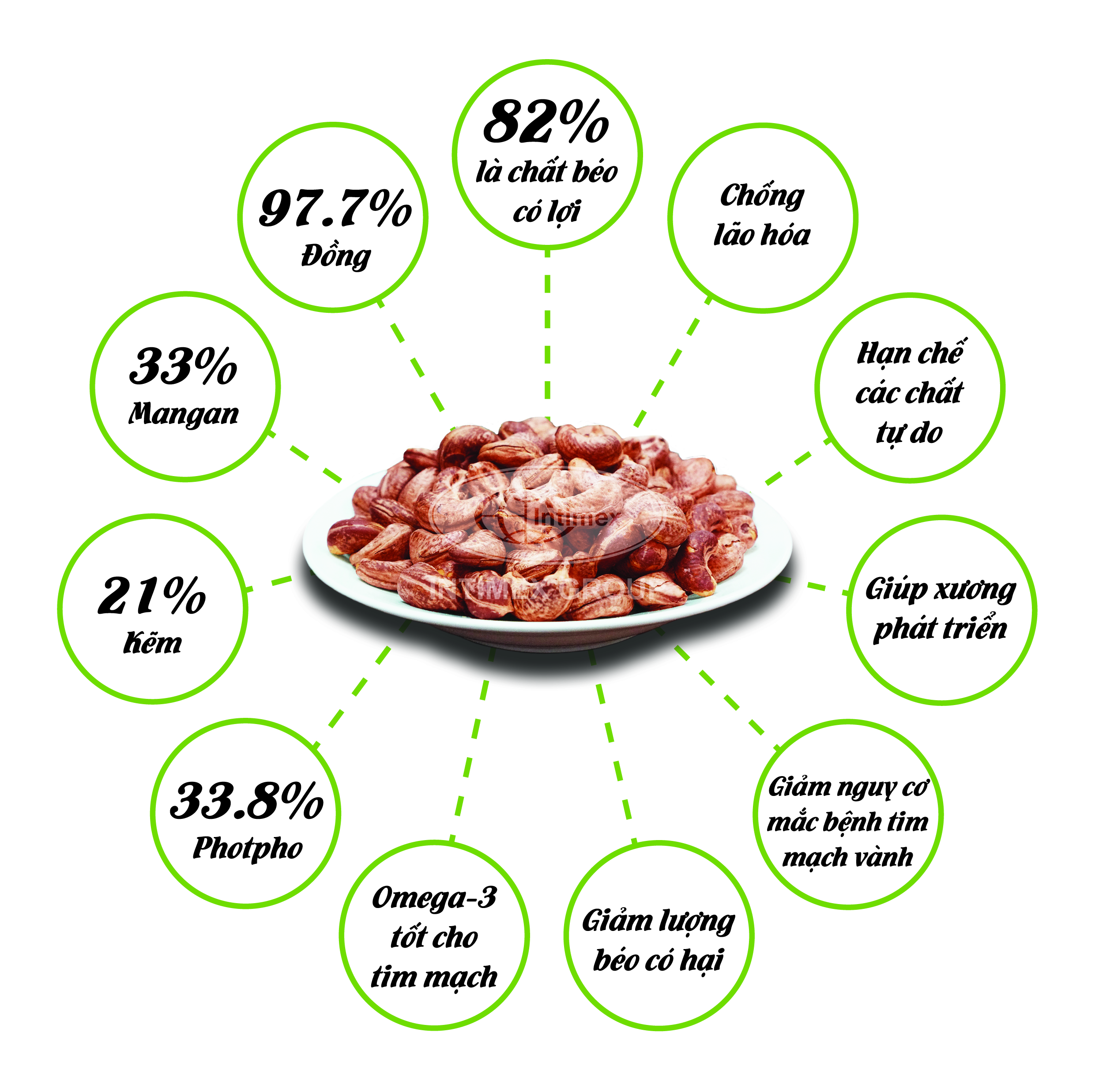 Lợi ích của hạt điều có vỏ lụa rang muối: Hạt điều có vỏ lụa rang muối mang lại nhiều lợi ích sức khỏe đáng kể. Dưới đây là ba lợi ích đặc biệt của