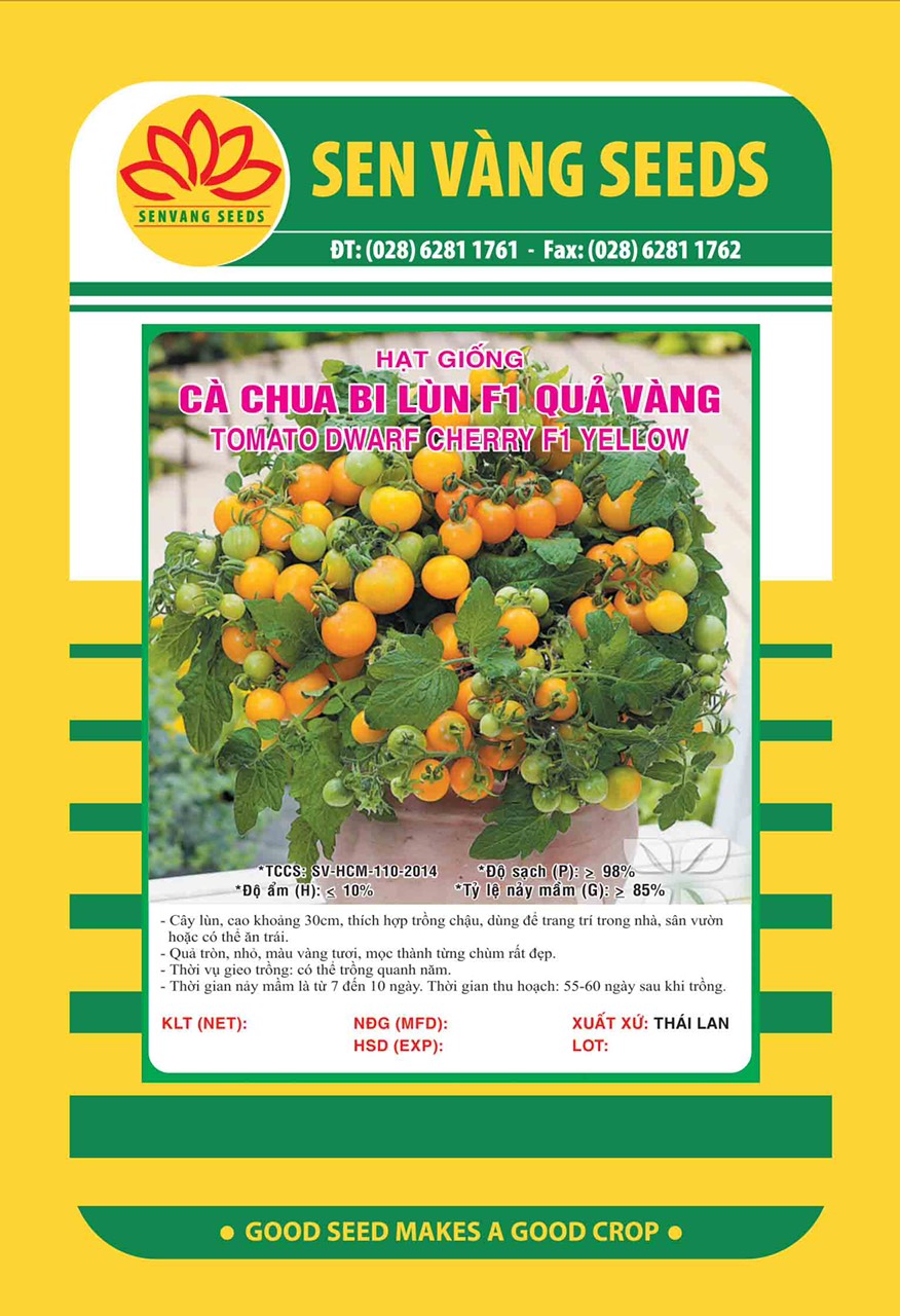 - Đặc tính giống: Cà chua Bi Lùn Vàng F1 - cây phát triển vô hạn, sinh trưởng phát triển khỏe, kháng bệnh tốt. Thân lùn cao 30cm, thích hợp trồng trong chậu trang trí trong nhà hoặc trong vườn. Trái hình tròn, thịt dày và ngọt, chín màu vàng rất đẹp. Trái nặng 15-16g