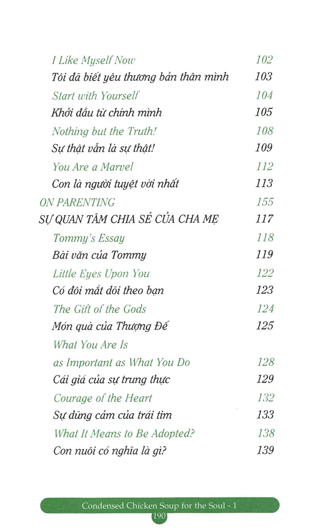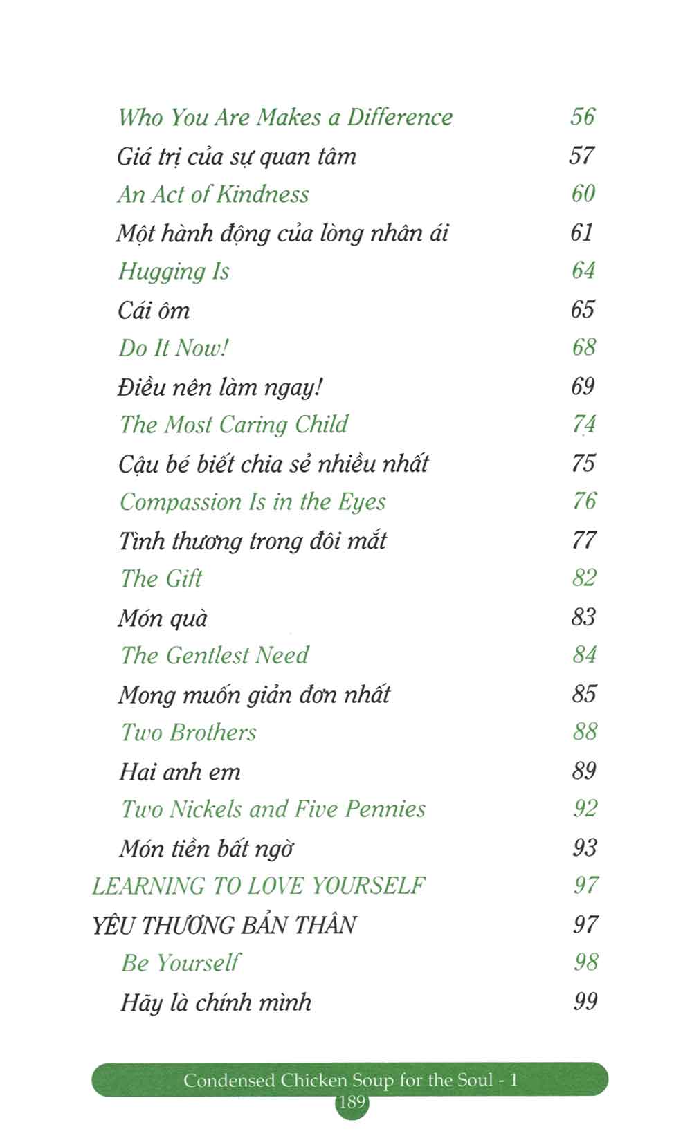 Chicken Soup for the Soul đã trở thành một thương hiệu lớn có giá trị không chỉ về mặt thương mại mà còn ở tính nhân văn cao đẹp. Những câu chuyện về tình yêu thương, về sự quan tâm của cha mẹ, về sự trải nghiệm khám phá và học hỏi trong bộ sách này sẽ khơi dậy khát vọng trong bạn, thôi thúc bạn dang rộng cánh tay chia sẻ đầy yêu thương với bạn bè và người thân, sẽ là niềm an ủi, xoa dịu những khi bạn căng thẳng tinh thần, sẽ làm bạn bừng sáng với những thời khắc của sự vượt lên chính mình và thức tỉnh cảm nhận. Chúng sẽ khuyến khích bạn kiên trì nuôi dưỡng, dám sống với ước mơ, sẵn sàng vượt qua những khó khăn, thử thách mà bạn chắc chắn sẽ gặp phải trên cuộc hành trình biến ước mơ thành hiện thực. Mỗi câu chuyện là một thông điệp có thể hàn gắn vết thương, làm thay đổi suy nghĩ, tâm hồn và đôi lúc, cả cuộc đời bạn.”