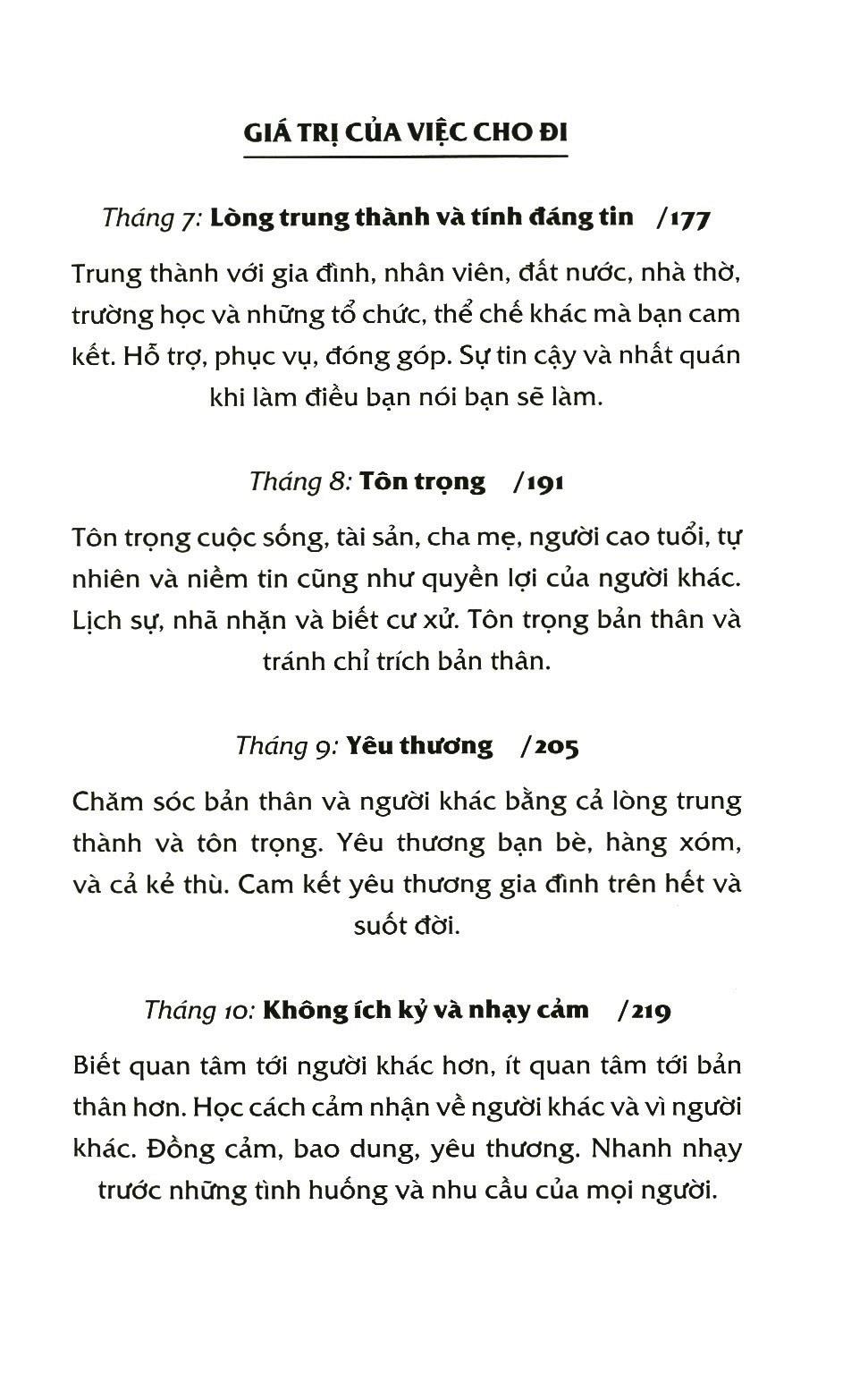 Tâm hồn của mỗi đứa trẻ đều giống như một cái cây. Để cái cây lớn lên cứng cáp, tốt tươi thì ngoài việc được chăm bón, tưới tắm thường xuyên, thứ trước nhất mà người trồng cây cần chuẩn bị chính là một hạt giống tốt lành. Cha mẹ gieo những hạt giống tốt lành vào lòng con, yêu thương con mỗi ngày để con lớn lên, để tâm hồn con xanh tươi, tấm lòng con rạng ngời, để con trưởng thành và dạn dĩ trước bão dông cuộc đời. Trong cuốn “Hạt giống tốt lành để con trưởng thành” (tên cũ là “12 mảnh ghép giá trị dành cho con”), những “hạt giống tâm hồn” đó đã được Linda Eyre và Richard Eyre cụ thể hóa dưới tên gọi của 12 giá trị cốt lõi. Những giá trị này sẽ làm nên nhân cách của một đứa trẻ, bao gồm: Thành thật (1), Dũng cảm (2), Trầm tĩnh (3), Tự lực và tiềm năng (4), Tự kỷ luật và điều chỉnh (5), Tính trung thực và sự trong sáng (6), Lòng trung thành và tính đáng tin (7), Tôn trọng (8), Yêu thương (9), Không ích kỷ và nhạy cảm (10), Lòng tốt và sự tử tế (11) và Công bằng và nhân từ (12). Cuốn sách nỗ lực giúp các bậc cha mẹ xác định hệ thống giá trị của mình và lựa chọn những “hạt giống tốt lành” nhất để gieo lên “mảnh đất” mới bồi trong lòng con cái. Hệ thống giá trị của bạn có thể rất giống - hoặc cũng có thể rất khác - với hệ thống giá trị trong cuốn sách, vì vốn dĩ trên đời này chẳng hề tồn tại hai hạt giống giống nhau hoàn toàn. Nhưng điều đó không thành vấn đề, bởi điều quan trọng nhất là bạn phải không ngừng phát triển nhóm giá trị riêng của gia đình mình và dạy lại những giá trị này cho con cái. Gia đình sẽ không bao giờ có thể bị thay thế bởi một thể chế, nơi mà những giá trị cơ bản được dạy và được học, giống như việc một hạt giống cây lê, lớn lên dù nó có nhiều – ít hay thậm chí chẳng có quả lê nào thì nó vẫn mãi mãi là cây lê, không khác được. Bên cạnh việc chỉ ra 12 giá trị như 12 hạt giống thích hợp với điều kiện thời tiết của 12 tháng trong năm, “Hạt giống tốt lành để con trưởng thành” còn bao gồm những phương pháp thực tiễn đã qua thử nghiệm và kiểm nghiệm, và được chia theo từng đối tượng trẻ: trẻ trước tuổi tới trường, trẻ lứa tuổi Tiểu học và trẻ vị thành niên. Ngoài “nông trại” là gia đình của chính tác giả, những phương pháp này còn được sử dụng và phát triển bởi những thành viên của tổ chức HOMEBASE – một tổ chức quốc tế gồm những người sử dụng các chương trình được thiết kế xoay quanh mô hình “nuôi dạy con bằng mục tiêu” để dạy cho con niềm vui, trách nhiệm, sự nhạy cảm và giá trị. Trích đoạn: Về hạt giống “Không ích kỷ và nhạy cảm” Biết quan tâm tới người khác hơn, ít quan tâm tới bản thân hơn. Học cách cảm nhận về người khác và vì người khác. Đồng cảm, bao dung, yêu thương. Nhanh nhạy trước những tình huống và nhu cầu của mọi người. Nhạy cảm và đồng cảm rõ ràng là những giá trị quan trọng, nhưng chúng cũng là những phẩm chất thường gắn liền với sự chín chắn, trưởng thành. Có thể dạy những giá trị này cho trẻ được không? Cậu con trai của chúng tôi, Josh, tổ chức một bữa tiệc trượt tuyết vào ngày sinh nhật lần thứ sáu. Shawni, cô chị 8 tuổi của Josh, cũng đi cùng để bố có người bầu bạn, và để giúp phục vụ món rượu táo và bánh ngọt. Có cả tá con trai ở bữa tiệc, và tất cả chúng đều la hét ầm ĩ, vui vẻ. Ít nhất thì cũng là tôi thấy thế. Sau đó, tôi thấy một điều rất kỳ lạ. Josh leo lên đỉnh đồi với hai người bạn, Shawni gặp thằng bé ở đó và nói: “Josh, đây là bữa tiệc tuyệt vời, hầu hết các em trai ở đây đều có một khoảng thời gian vui vẻ, nhưng cậu bé đằng kia (chỉ tay) lại bị bỏ rơi, và trông cậu bé có vẻ không vui lắm, còn cậu bé mặc áo khoác đỏ ở chân đồi lại có vẻ hơi khó chịu vì chiếc xe trượt tuyết chạy không tốt lắm thì phải. Em nên đến làm cho hai bạn cảm thấy tốt hơn đi.” Cô con gái 8 tuổi nhạy cảm này đã để ý được những việc mà tôi không để ý - rằng có hai cậu bé không vui như những người còn lại. Thay vì lo lắng, buồn phiền hoặc trầm ngâm về việc chỉ có mình là con gái ở nơi đó, lại còn lớn tuổi hơn những cậu bé còn lại, con bé lại quan sát chúng, để tâm về chúng và quan tâm, lo lắng cho chúng. --- Richard Một số trẻ có khả năng tự nhiên và bẩm sinh về quan tâm và nhạy cảm. Những trường hợp như vậy khá hiếm, đa số trẻ, đặc biệt là trẻ đang tuổi mới lớn tự coi mình là trung tâm, là “cái rốn của vũ trụ”. Quả thật, hầu hết những vấn đề mà trẻ vị thành niên phải đối mặt (dù là nổi loạn theo cách nào đi chăng nữa hay là xấu hổ cùng cực hoặc rút lui) đều bắt nguồn từ việc chúng quá quan tâm tới bản thân. Tuy nhiên, trẻ có thể bắt đầu học để trở nên nhạy cảm và không 