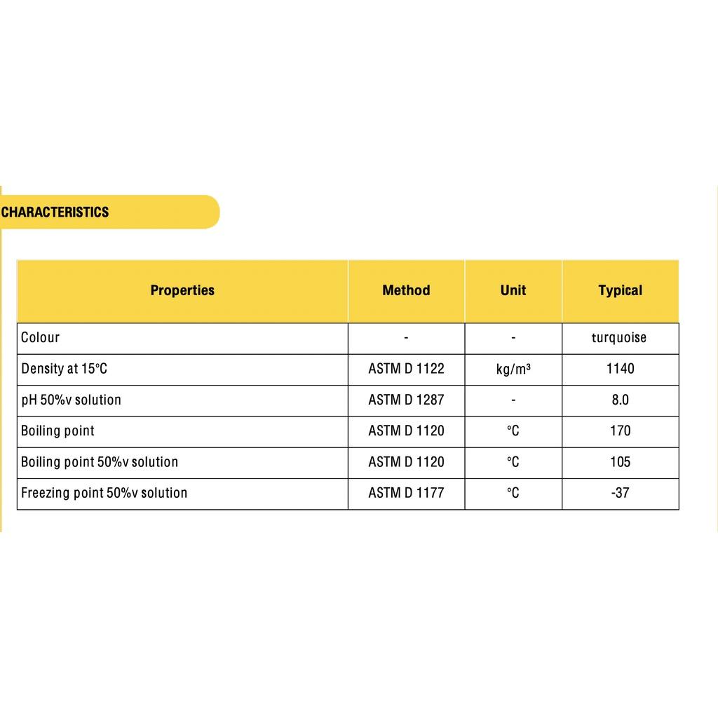 ĐẶC TÍNH: - Nhiệt độ sôi: 170 - Màu sắc: xanh - Với thành phần bao gồm chất ức chế ăn mòn dựa trên các muối vô cơ giúp bảo vệ tất cả các bộ