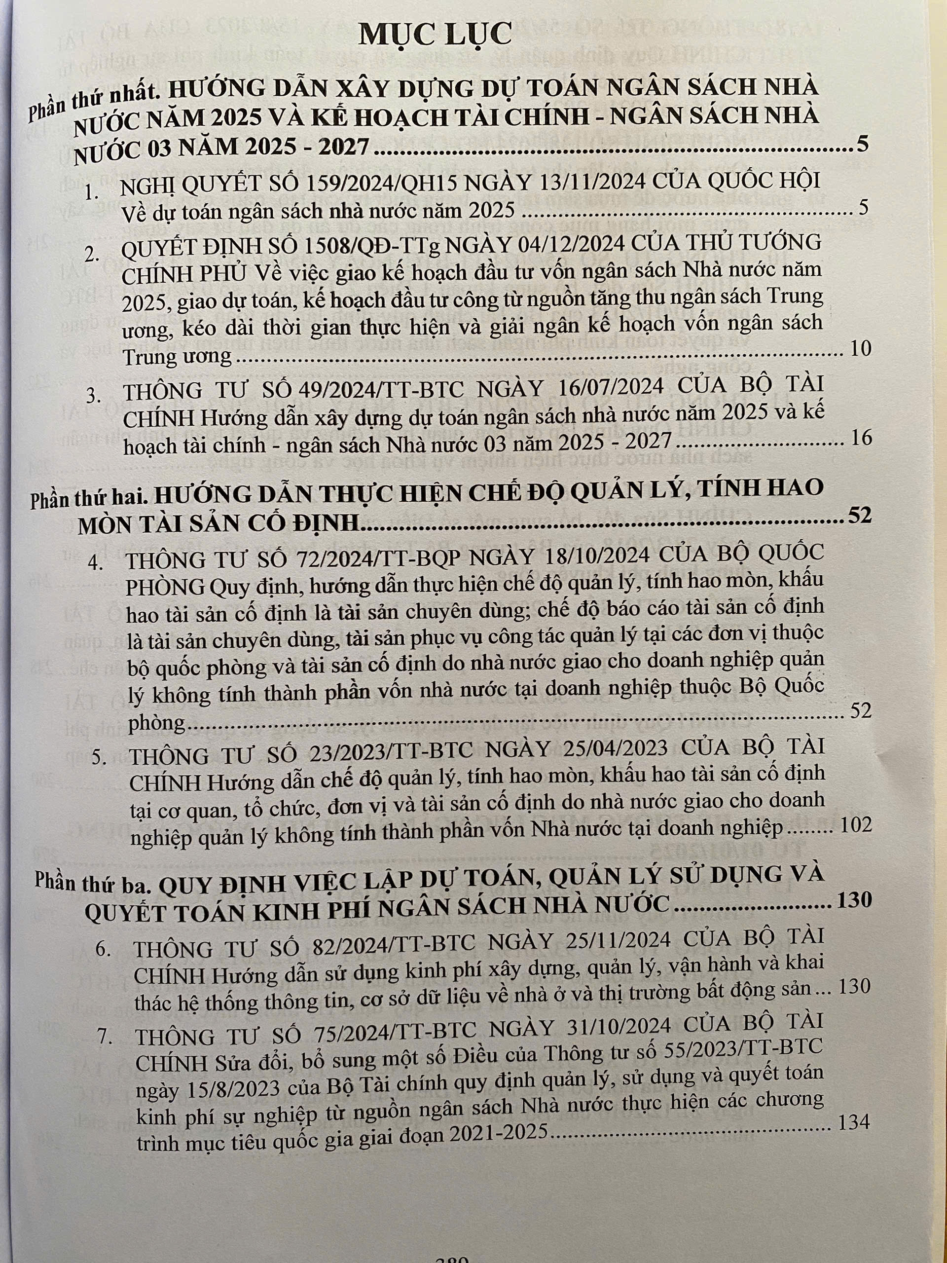 Ngày 26/11/2024, Bộ Tài chính ban hành Thông tư 84/2024/TT-BTC sửa đổi, bổ sung một số điều của Thông tư 324/2016/TT-BTC ngày 21/12/2016 quy định hệ thống mục lục ngân sách Nhà nước đã được sửa đổi, bổ sung tại Thông tư 93/2019/TT-BTC ngày 31/12/2019 và Thông tư 51/2022/TT-BTC ngày 11/08/2022. Mục tiêu chính của việc sửa đối này là cải thiện tính linh hoạt, hiệu quả và phù hợp hơn với các yêu cầu quản lý ngân sách nhà nước trong bối cảnh mới. Một số mã mục, tiểu mục được thay đổi để phù hợp với thực tiễn thu chi ngân sách hiện tại. Ngoài ra, các điều chỉnh nhằm đảm bảo phản ánh đầy đủ và rõ ràng hơn nguồn gốc cũng như mục đích sử dụng ngân sách. Nhằm giúp các cơ quan, đơn vị nắm bắt kịp thời và thực hiện tốt việc quản lý tài chính, lập dự toán, thanh quyết toán thu chi ngân sách nhà nước Nhà xuất bản Tài Chính xuất bản và phát hành cuốn sách: HỆ THỐNG MỤC LỤC NGÂN SÁCH NHÀ NƯỚC (Sửa đổi, bổ sung) Nội dung cuốn sách gồm các phần chính sau: Phần thứ nhất. HƯỚNG DẪN XÂY DỰNG DỰ TOÁN NGÂN SÁCH NHÀ NƯỚC NĂM 2025 VÀ KẾ HOẠCH TÀI CHÍNH - NGÂN SÁCH NHÀ NƯỚC 03 NĂM 2025 - 2027. Phần thứ hai. HƯỚNG DẪN THỰC HIỆN CHẾ ĐỘ QUẢN LÝ, TÍNH HAO MÒN TÀI SẢN CỐ ĐỊNH. Phần thứ ba. QUY ĐỊNH VIỆC LẬP DỰ TOÁN, QUẢN LÝ SỬ DỤNG VÀ QUYẾT TOÁN KINH PHÍ NGÂN SÁCH NHÀ NƯỚC. Phần thứ tư. HỆ THỐNG MỤC LỤC NGÂN SÁCH NHÀ NƯỚC ÁP DỤNG TỪ 01/01/2025 Luatvietbook xin trân trọng giới thiệu cuốn sách đến bạn đọc!