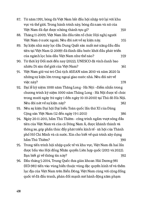 Tất cả những vấn đề này đã được chọn lọc để gói gọn trong 100 câu hỏi đáp, do nhóm Nhân văn trẻ - gồm các giảng viên khoa Sử và Quan hệ quốc tế Trường Đại học Khoa học Xã Hội Nhân Văn thực hiện. Sách có phần phụ lục danh sách những vị lãnh đạo Đảng và nhà nước trong thời kỳ này, đồng thời điểm những sự kiện tiêu biểu nhất qua 37 năm. Mỗi câu hỏi đáp đều có hình ảnh tư liệu minh họa.