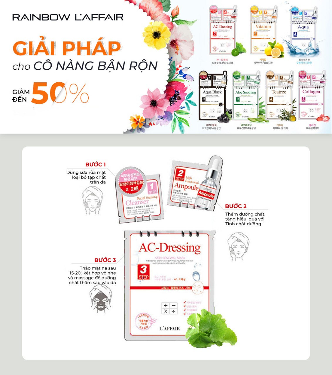 ✨Hộp 10 mặt nạ tái tạo - trẻ hóa da - ngăn ngừa mụn 3 bước Rainbow L'affair Ac-dressing 250ml