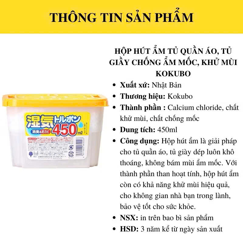 HỘP HÚT ẨM, KHỬ MÙI, CHỐNG NẤM MỐC KOKUBO 450ML - NỘI ĐỊA NHẬT **KHẢI MINH STORE - HÀNG NỘI ĐỊA NHẬT CHÍNH HÃNG** - Cam kết 100% hàng chính hãng có nguồn gốc xuất xứ