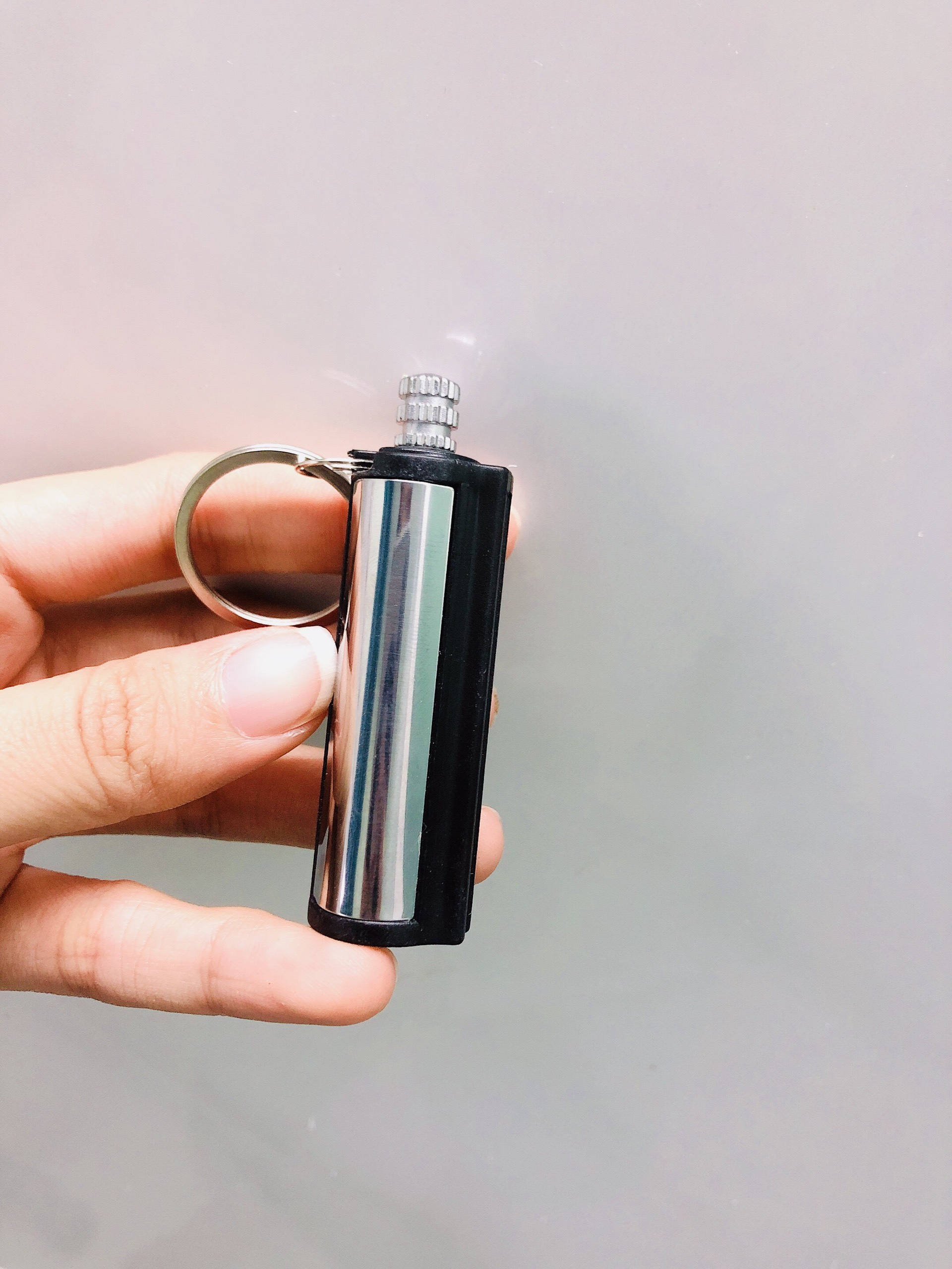 Hột quẹt bật lửa móc khóa diêm xăng sinh tồn hình Trụ Tròn - xài xăng - Nguyên liệu: kim loại nguyên khối – Kích thước: Chiều cao: 5 cm, Chiều rộng: 1.3 cm –