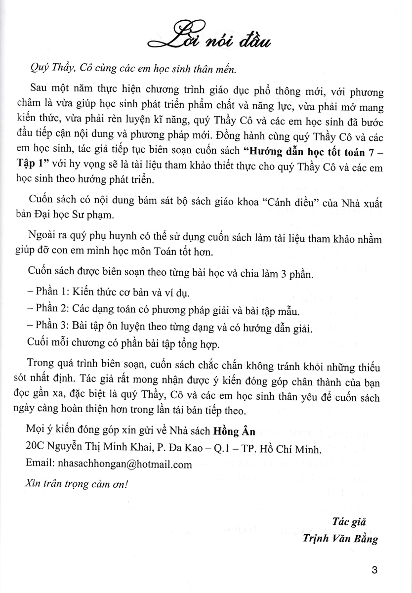 Sau một năm thực hiện chương trình giáo dục phổ thông mới, với phương châm là vừa giúp học sinh phát triển phẩm chất và năng lực, vừa phải mở mang kiến thức, vừa phải rèn luyện kĩ năng, quý Thầy Cô và các em học sinh đã bước đầu tiếp cận nội dung và phương pháp mới. Đồng hành cùng quý Thầy Cô và các em học sinh, tác giả tiếp tục biên soạn cuốn sách Hướng Dẫn Học Tốt Toán Lớp 7 - Tập 1 (Bám Sát SGK Cánh Diều) với hy vọng sẽ là tài liệu tham khảo thiết thực cho quý Thầy Cô và các em học sinh theo hướng phát triển.