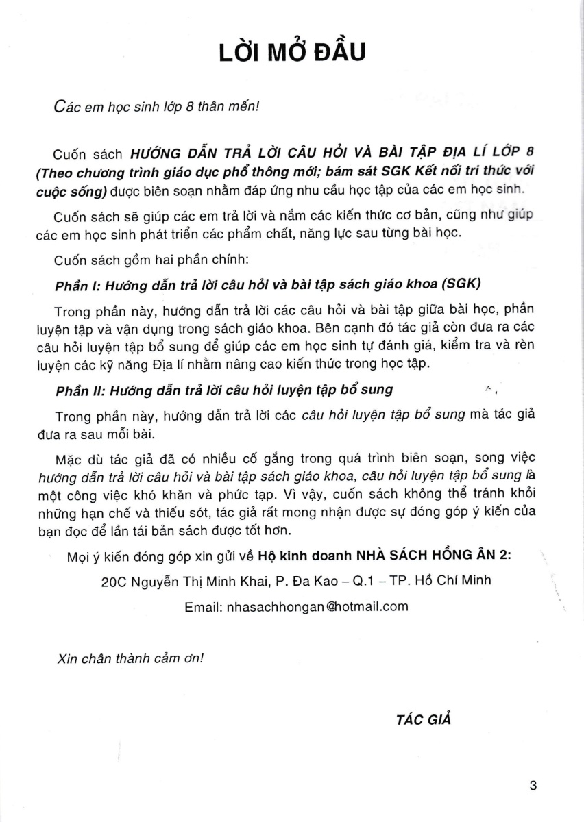Mặc dù tác giả đã có nhiều cố gắng trong quá trình biên soạn, song việc hướng dẫn trả lời câu hỏi và bài tập sách giáo khoa, câu hỏi luyện tập bổ sung là một công việc khó khăn và phức tạp. Vì vậy, cuốn sách không thể tránh khỏi những hạn chế và thiếu sót, tác giả rất mong nhận được sự đóng góp ý kiến của bạn đọc để lần tái bản sách được tốt hơn.