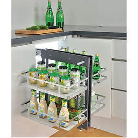 Giá đa năng để giao thớt, chai lọ, gia vị Chất liệu: Inox 304 dạng nan tròn Phiên bản bắt cánh ngăn kéo và mở cánh Ray âm giảm chấn Angas Độ rộng cánh: 300mm