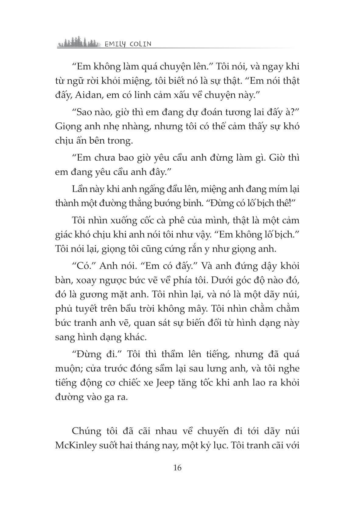 “Tôi lại thiếp đi khi đang suy nghĩ về cảm giác khi có được mọi thứ bạn muốn, chỉ để đánh mất nó… và biết điều bạn mong muốn, nhưng lại không có nó. Suy cho cùng, Aidan James và tôi quả là hai kẻ đối lập. Tất nhiên chúng tôi cũng còn một sự khác biệt quan trọng khác nữa: Tôi vẫn đang còn sống.”