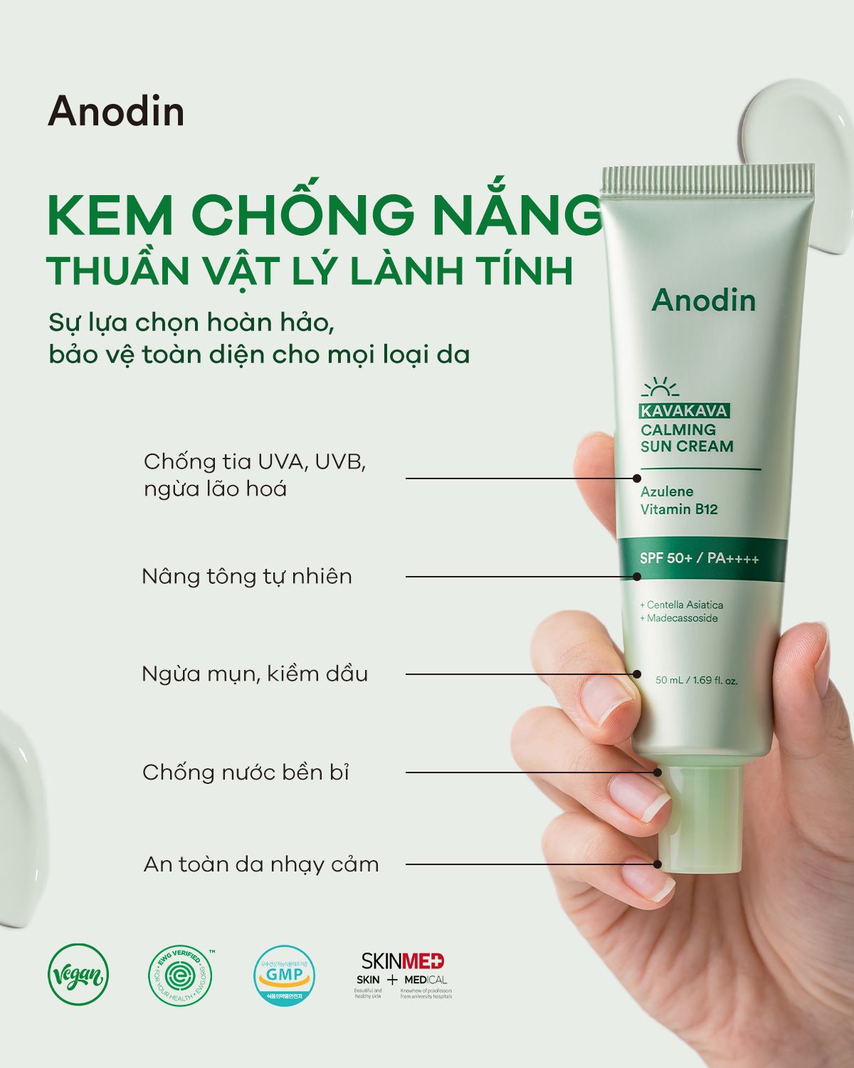✨Kem chống nắng rau má kiềm dầu nâng tông cho da dầu, nhạy cảm Anodin Kava Kava Calming Suncream 50ml