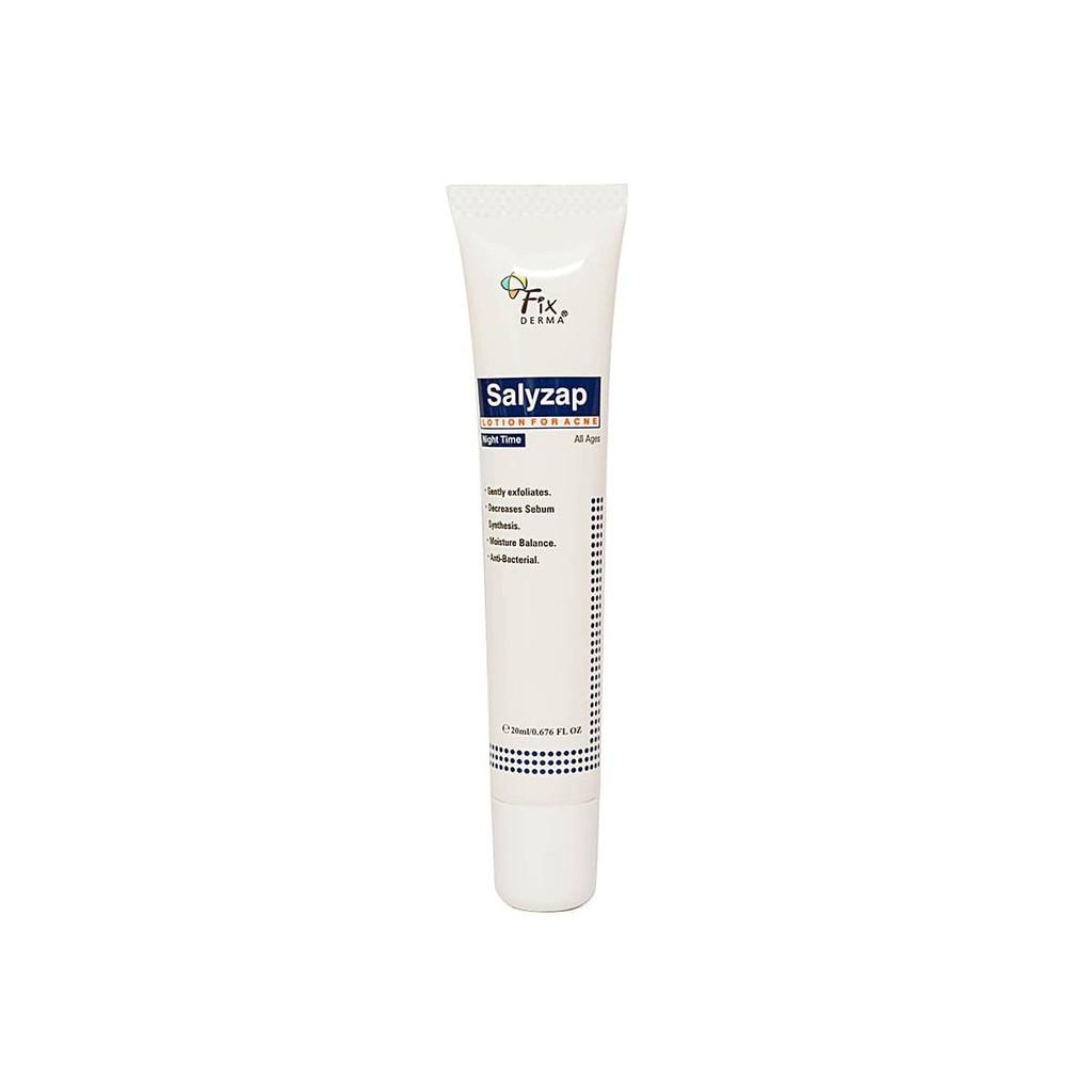 - Công dụng Fixderma Lotion Giảm Mụn Ban Đêm Salyzap Lotion For Acne 20g với tinh chất thiên nhiên (lá trà xanh, tinh dầu tràm) kết hợp trong sản phẩm dạng lotion giúp giảm ngay mụn. Ngăn ngừa hình thành nhân mụn mới, giảm tổng hợp bã nhờn, kháng khuẩn, làm thông thoáng lỗ chân lông, dưỡng ẩm. Đặc biệt Làm dịu vùng da bị tổn thương và ngăn ngừa các kích ứng do mụn gây ra. An toàn cho mọi loại da kể cả da nhạy cảm
