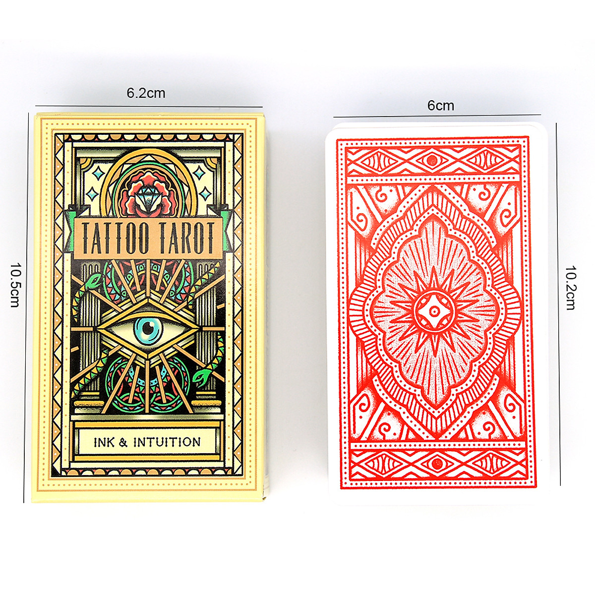 Thông số chi tiết bộ bài Tattoo Tarot: Ink & Intuition Kích thước: 6.6 x 12CM Ngôn ngữ: tiếng anh Số lượng thẻ: 78 và guidebook Quét mã QR để xem file hướng dẫn Đóng gói: hộp màu Trọng lượng: 100g (bao gồm cả hộp) Tác giả: Diana McMahon-Collins, MEGAMUNDEN Những hình xăm cũng có thể đưa ra thông điệp dành cho bạn. Bộ bài Tattoo Tarot Ink & Intuition là tập hợp 78 lá bài với nét vẽ theo phong cách hình xăm, đậm chất sang trọng và cực kỳ huyền bí. Nếu bạn trót yêu thích thiên hướng nghệ thuật trong những hình xăm thì bộ bài này rất phù hợp với bạn. Bộ bài Tattoo Tarot Ink & Intuition sử dụng các tông màu theo phong cách vintage cổ xưa, sử dụng chuẩn Marseille làm cho bộ bài thêm phần tinh tế và đầy thử thách. Có thể bạn đã sử dụng qua các bộ bài Tarot theo chuẩn RWS hay Thoth thì Tattoo Tarot nên xuất hiện trong bộ sưu tập của bạn, tiên phong cho việc học tập và sử dụng Tarot theo chuẩn Marseille.